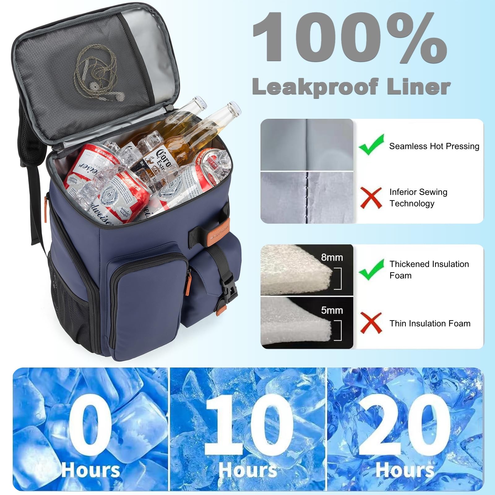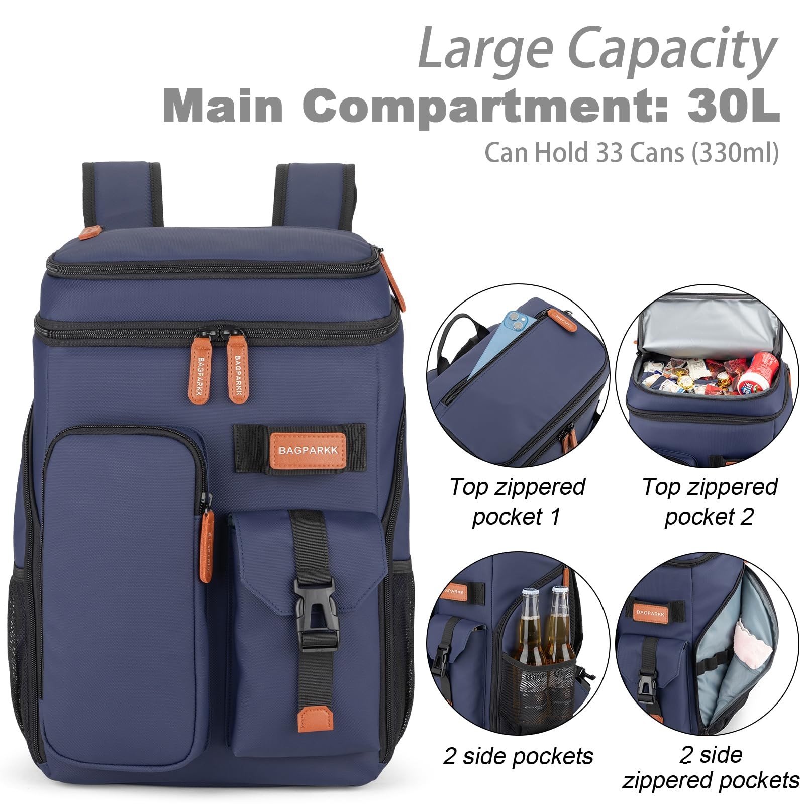 Insulated Cooler Backpack,33 Cans Multifunctional Double Deck 33Can, Blue Description Features: Insulated Cooler Backpack: Bagparkk backpack cooler is insulated with thickened 8mm foam, together with advanced silver PEVA seal for blocking UV rays to keep beverages and foods cool up to 20h,We recommend storing hot and cold and separately for better results Leak-proof & Water Resistant: Our cooler backpack liner adopts high-tech seamless hot pressing process for leak-proof. The zipper is not leakproof, please be careful not to tip over when using it.High-density Scratch-resistant nylon material & Waterproof PVC Fabric can effectively resist external moisture and wear, protect the safety and dryness of the items inside the pack Large Capacity & Multiple Compartments: Featured 2 insulated compartments for cooling drinks & dry foods,Main bag can hold up to 33 cans(330ml). 1 top zipper pocket, 2 front pocket and 4 side pockets to hold your snacks and other accessories.Beach backpack also hidden pockets on the back for your mobile phone and valuables.There is one bottle opener included for more convenience Sternum Strap & Ergonomic Design: Thicker padded back with ergonomic breathable design paired with adjustable,breathable and padded S shoulder straps help to reduce fatigue during a long day of trip. The adjustable chest buckle works perfectly to distribute the pack’s weight and keep it steady and centered,Reflective strips on the straps reduce the risk of traveling at night,perfect for lunch, picnic, work, travel, hiking, biking, park, beach and zoo Stylish Appearance and Ideal Gift: Our Convertible insulated backpack can use it as a travel backpack,Arrive in style—back trolley sleeve for easily sliding over your luggage/suitcase handles, dual padded shoulder straps provide optimum comfort. With this fashionable back pack cooler, you will get a lot of compliments.It's a great gift idea for men & women Product Details: Handling We will ship all orders within 1 business day of payment. Delivery We Do Not Ship Outside of the Continental US. Return Policy All items qualify for returns within 30 days of receipt. Buyer is responsible for return shipping on any item that is not damaged. Feedback We take our reputation seriously, we buy and sell online, so we understand the value of trust. If you are unsatisfied with your order, please contact us and we will work with you to resolve it to your satisfaction.