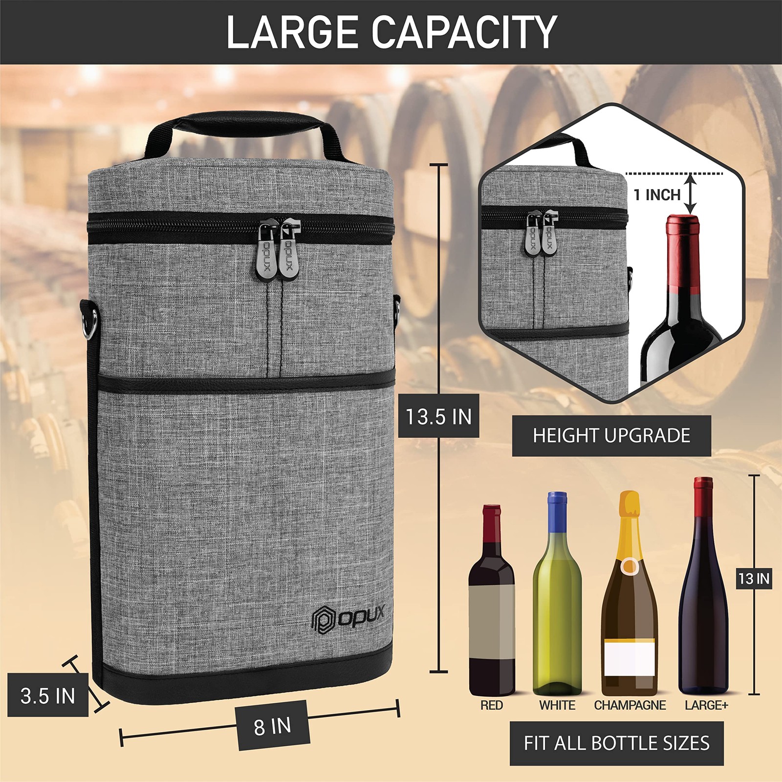 2 Bottle Wine Bag Tote Carrier | Leakproof Insulated Wine Cooler Bag for Travel, BYOB, Picnic | Padded Portable Wine Bottle Bag for Dinner Party, Christmas Gift for Wine Lovers, Women, Men Perfect for carrying wines with you while you're eating at a restaurant or a picnic, this Premium Insulated 2 Bottle Wine Tote Carrier by is equipped with dual zippers for easy opening. This wine tote carrier allows you to store more items with its front side pocket. It is lightweight and versatile, making it perfect to carry to any special occasion. A corkscrew is included with the tote carrier so you will never have to worry about bringing one from the house. This Premium Insulated 2 Bottle Wine Tote Carrier by measures 8 x 3.5 x 12.6 (L x W x H) creates quality products for your many lifestyles. Our Vision To provide premium kitchen and wine products that greatly simplifies your life. We will continue to innovate and bring exciting products to market so you can achieve more in life! Our Products At , we offer an extensive line of kitchen tools (such as salt & pepper mills), lunch bags, and wine bags/accessories made of highest quality for all occasions. Our products are meticulously designed with materials and functions that truly simplify your life so you can focus on creating your favorite meals or entertaining your guests. 2 BOTTLE WINE CARRIER TOTE: Our portable wine bag cooler is the ultimate wine bottle bag for your travel, parties, picnics, outdoor beach trips, and BYOB dinner events. Designed to transport two bottles, this padded double bottle wine carrier keeps your favorite wine chilled and protected. It's an essential accessory for wine lovers, making it an ideal gift for women, men, and drinkers who love a good glass of wine. Celebrate special days with stylish and functional wine holder bag. INSULATED & LEAKPROOF WINE COOLER BAG: Our thermal wine cooler bag keeps your wine at the perfect temperature for hours. Whether you're carrying the wine to a bar, restaurant, picnic, camping, or road trips, this wine side bag has three layers of insulating material, maintaining a steady temperature for your glass bottles, chilled wines, frozen liquor bottles and cool beer beverages. The leakproof lining ensures no spills, and it's easy to cleana must have item for wine lovers on the go! PROTECTIVE WINE BOTTLE PURSE: Safely travel with your precious wine bottles with our 2 bottle wine tote bag. Our padded wine travel bag is great for BYOB dining out at the restaurants, attending wine tastings, weddings, parties, or beach picnic trips. The thermal insulated padding provides extra protection against breakage. Its portable design makes it a wine suitcase luggage case for air plane travel. insulated wine carrier ensures proper storage and serves your favorite wine in style. WINE GIFTS FOR WINE LOVERS WOMEN: This grey canvas wine tote bag is a great wine accessory gift for wine enthusiasts, sommeliers, and wine drinkers. Wine gift set idea for wine lovers, men, women, family and dad during Christmas, Valentines Day, Anniversary, Mothers, Fathers day and Birthday. The wine carrier is also a holiday present for mom, coworkers, couples during weddings, housewarmings, engagements, bridal shower, hostess, secret santa, white elephant and gift basket swap. PICNIC WINE BAG CHILLER: 2 bottle wine tote carrier kit measures 8.5 x 4 x 14 (L x W x H), it fits most standard 750ML wine bottles. Crafted from high-quality 600D polyester, this wine bag picnic essential is built to last, while the PU leather trim adds a touch of sophistication. Great wine gifts for women and wine accessories gifts for men, this classy wine bag can accommodate other alcohol bottles such as liquor, champagne, spirits, cabernet, pinot and even wine glasses.