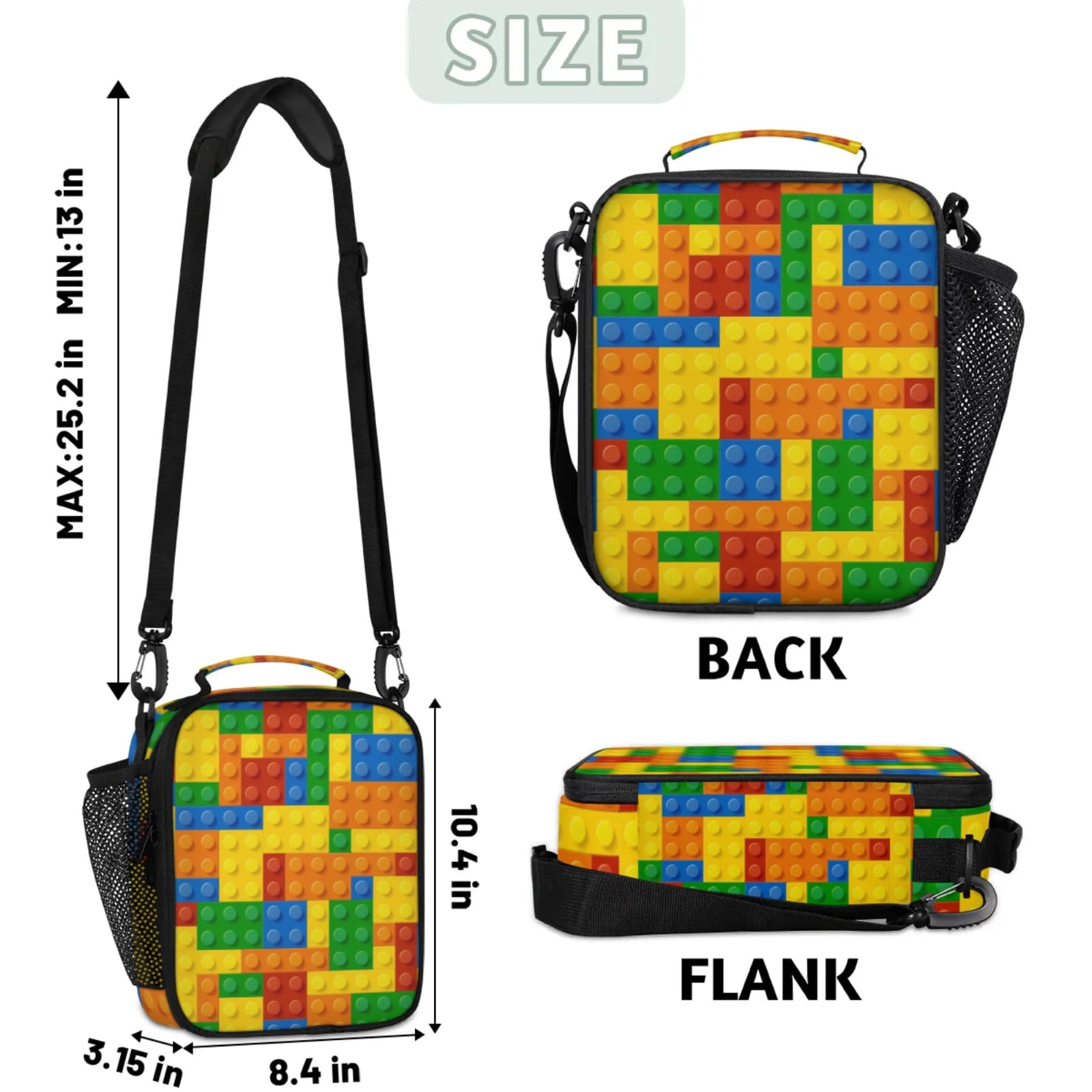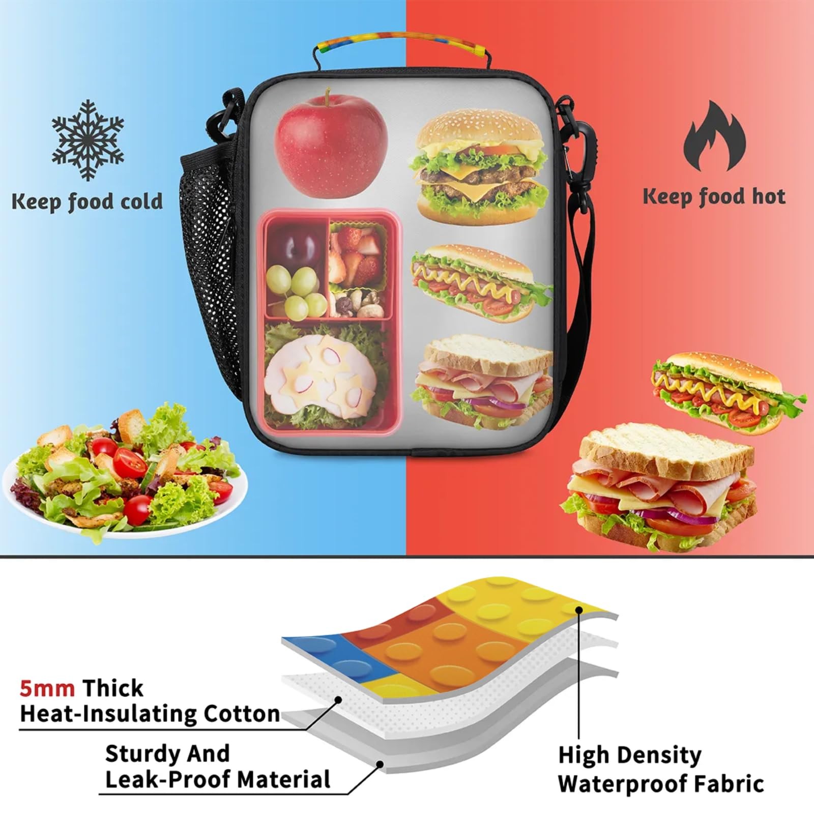 Lunch Boxes Bags for Kids Make Lunch Time Easy and Fun! Material: Waterproof polyester Size: 10.4 x 8.4 x 3.15 inches Closure: Double zipper closure Portable: Top handle/adjustable detachable shoulder strap Easy to Clean: Just wipe it off Structure: Main pocket, Interior zippered mesh pocket, side mesh pocket Dual Zipper: Made of high quality smooth double zipper, don't worry that the zipper will be easily damaged. The double zipper design makes it easy to open and close. Practical Side Pocket: Our lunch box has a mesh side pocket for extra storage of umbrellas, cutlery, water bottles and other items. Adjustable Shoulder Strap: The high quality buckle allows you to adjust the shoulder strap to the most comfortable length. Detachable buckle handle, easy to carry, which can attach to your backpack, enabling you to carry the lunch bag in different ways! Fun & Stylish Designs: Available in a variety of vibrant colors and patterns, this lunch bag is sure to match your child’s personality. Bold and fun playful prints, there’s a design for every taste! Practical Leak-proof Lunch Boxes: If you are looking for a kind of thermal insulation bag, and want your family to eat hot food and fresh fruit, you should be interested in our lunch bag. Our thermal insulation bag can not only keep you warm in the cold winter, but also refrigerate in the hot summer. It also has shock absorption effect, and can keep food cold / hot / fresh in a few hours! 【Insulated Lunch Bag】Our lunch coolers bag made with premium waterproof and insulated materials, this lunch box organizer keeps food at the perfect temperature for hours. Whether it's a warm meal or a cool snack, your child's lunch will stay fresh until it's time to eat 【Lightweight & Easy to Carry】The size of this bento box bag is 10.4 x 8.4 x 3.15 inches, designed with kids in mind, this lunch boxes is lightweight and easy to carry, making it perfect for school, picnics, or family outings. The adjustable shoulder strap and top handle provide multiple carrying options for added convenience 【Travel Friendly Design】lunch box for boy has a large main pocket with an internal zippered mesh pocket that can easily fit sandwiches, snacks, drinks, cutlery, etc.; there is a mesh pocket on the side that can hold a water bottle or paper towels, etc., for easy access; it provides plenty of space for lunch. Despite its large capacity, it is compact enough to fit easily into a backpack or handbag 【Easy to Clean】Reusable lunch snack bags has a high quality waterproof and leak-proof lining, easy to clean, just wipe it with a damp cloth. Withstand daily use, perfect for kids lunch tote bags 【Versatile Applications】Multi-functional lunch bag, fit for many occasions, these lunch bags can be used as shopping bag, picnic bag, sundry bag, food bags, suitable for men women adult kids ,teen girls. Perfect for many outdoor activities, such as work, office, school, hiking, picni, travel, fishing, etc.