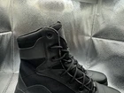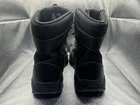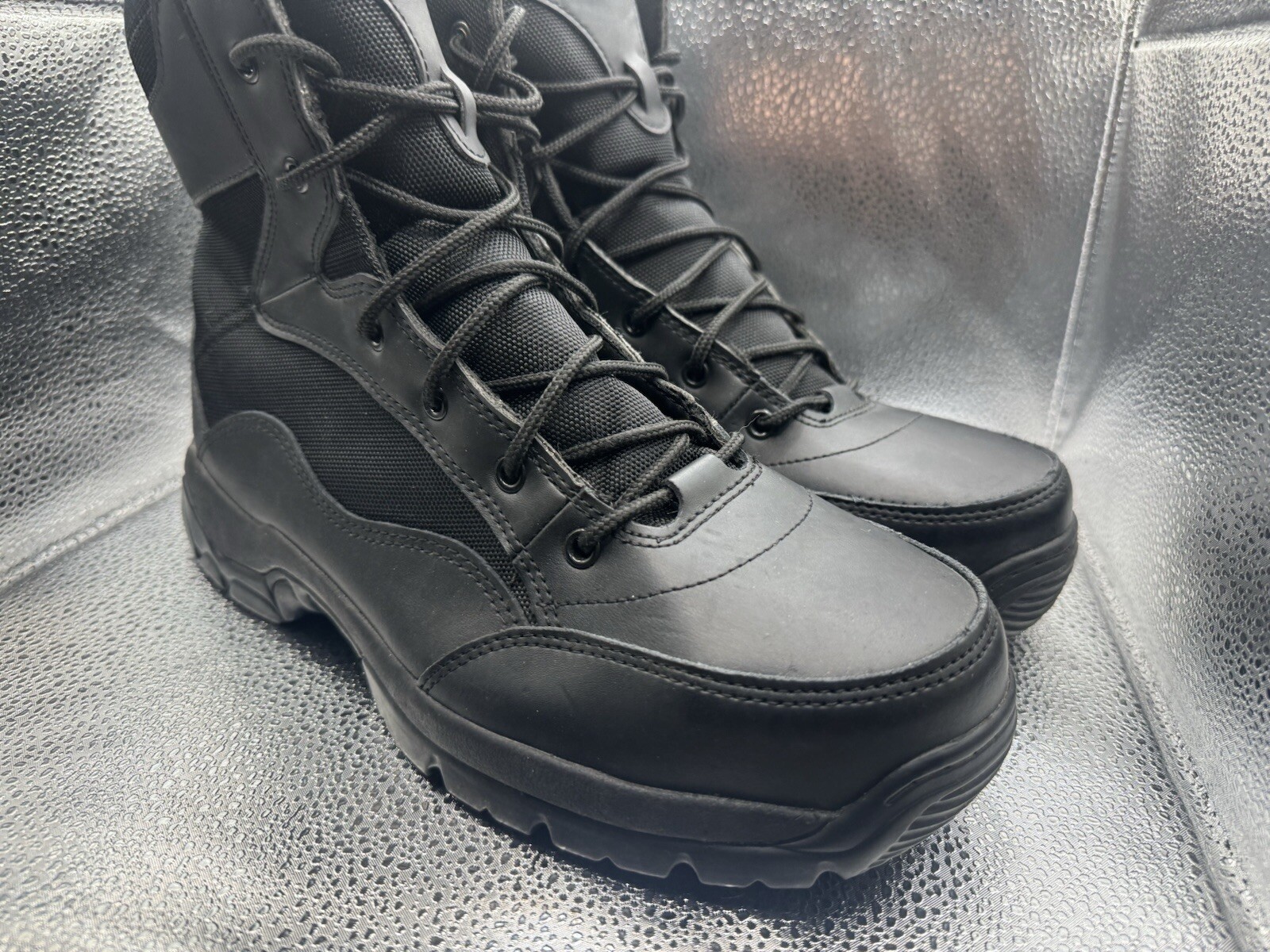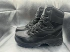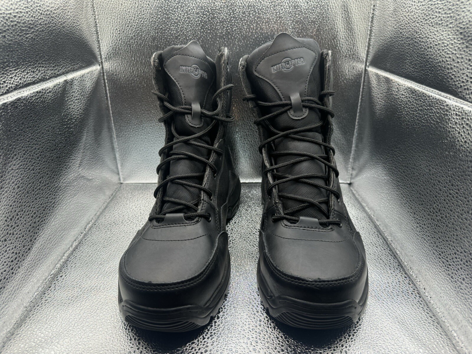 These Interceptor boots are designed for tactical safety in mind, with a round toe and lace-up closure. The steel toe provides composite protection while the rubber outsole offers slip-resistance and non-slip properties. The boots are made of leather with a synthetic lining and insole for added comfort. The boots are available in US shoe size 10.5, UK shoe size 9.5, and EU shoe size 44. They are suitable for outdoor activities, winter, summer, fall, and spring. The solid black color and ankle shaft style make them a versatile addition to any wardrobe. The boots are not handmade and are not customized.