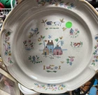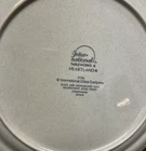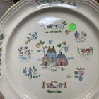 This is an International China Heartland large 12" chop plate round platter made of bone china from America. The design features a cream background with multicolored patterns, showcasing a farm theme in a country style. It is a vintage original piece from the 2000-2009 time period, manufactured in Japan with a painted backstamp. Perfect for all occasions, this plate is ideal for serving and displaying food.