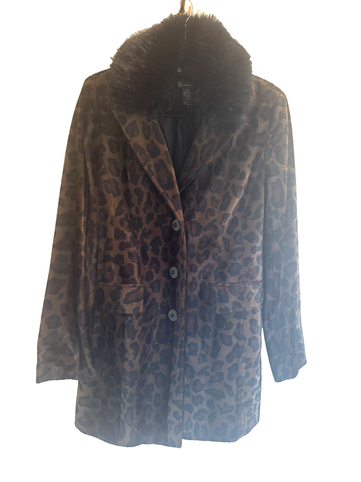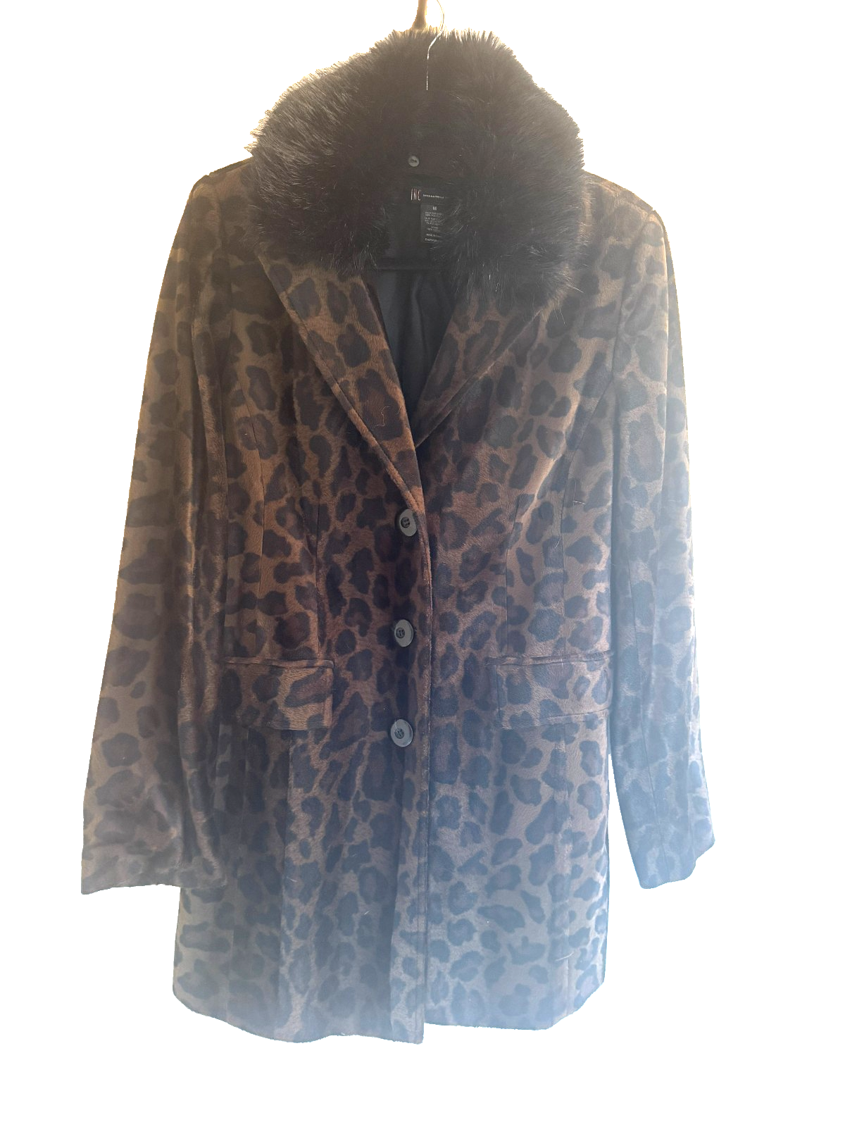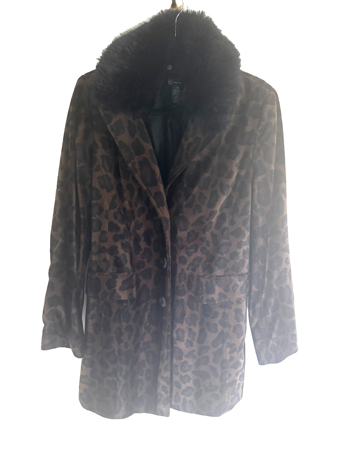 Make a bold style statement with this INC International Concepts women’s animal print coat in size Medium , complete with a removable faux fur collar for two stylish looks in one. This mid-length outerwear features a chic leopard-style print, flattering tailored shape, and soft lining — perfect for elevating your fall and winter outfits. Ideal for nights out, city chic wardrobes, and anyone who loves bold fashion. Pair it with a black dress for a Parisian chic look or with jeans and sneakers for something a bit edgier. Features Brand: INC International Concepts Women’s Size M Animal print (leopard-inspired) Removable faux fur collar for versatile styling Mid-length coat — polished and fashionable Button front closure Fully lined for warmth and comfort Great for fall & winter, dressy or casual wear Faux pocket detail Condition Excellent pre-owned condition with minimal signs of wear. Measurements Pit to Pit 18.5 inches Sleeve 25 inches Length 31.5 inches