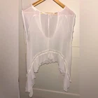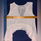 This is a Free People sheer chiffon blouse in blush pink. It features a round neckline, short flutter sleeves, ruffle accents, and a relaxed fit. The top has a cropped style with wide straps and a pullover closure. Perfect for summer or spring, it is lightweight, breathable, and sheer, making it ideal for travel, parties, or casual wear with a bohemian or beach theme. Size L.