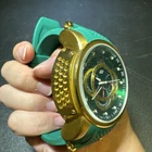 Introducing the Invicta 19329 Men's Watch, a luxurious timepiece with a 52mm polished stainless steel case and a green dial. This watch features a quartz movement, water resistance up to 100m, and a chronograph function. The bezel is gold in color and the band is made of both stainless steel and silicone materials. This watch is perfect for any occasion, whether it's a formal event or a casual day out. It comes with a date indicator and scratch-resistant mineral crystal. The lug width is 26mm and the band is strap-style. This modern watch is a great addition to any collection. Personal used condition in collection. Not currently running. NEEDS NEW BATTERIES! Bought couple years back and it's been in storage. No box. Just the watch itself with the band. Very good pristine condition. Currently sold out at retail value on official site: $289.00 very rare to find. offers welcome.