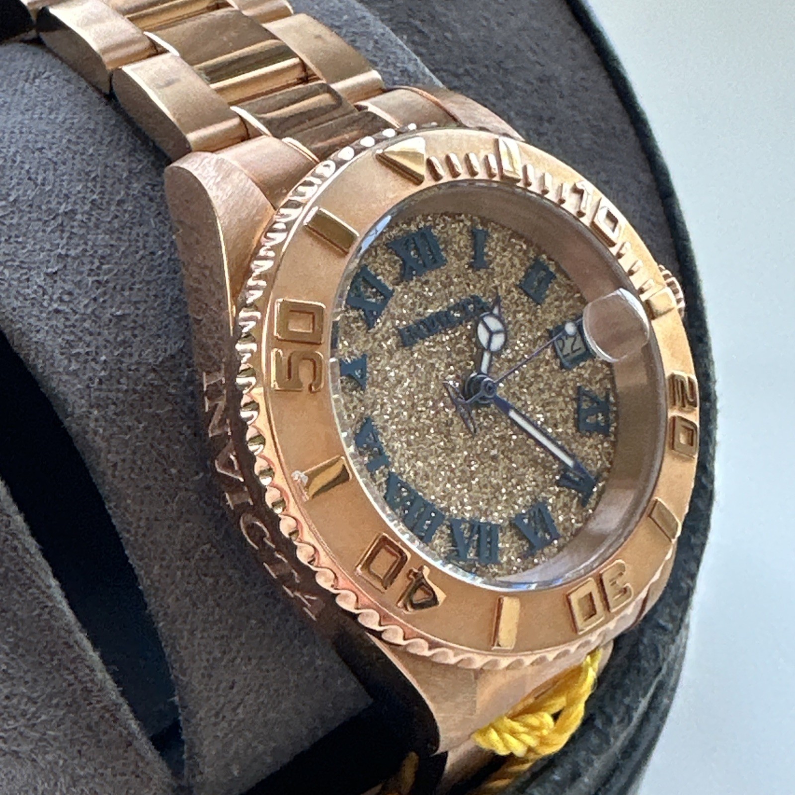 Invicta Angel Date Quartz Rose Gold Dial Ladies Watch 33361 #IN33361 Description Rose Gold-tone dial enhanced by lumninous hands. Rose Gold-tone stainless steel case with a rose gold-tone stainless steel band. Quartz movement. 100 meters / 330 feet water resistance. Fixed bezel. Scratch Resistant Mineral crystal. Solid caseback. Fold Over with Push Button Release clasp. Pull / Push crown. Case size 34 mm x 11 mm. Band 16 mm x 7.75 incheslong. Invicta 33361 Angel Watch. Angel Series: 33361 Model: Watches Subclass: Quartz Movement: 34 mm Case Size: Stainless Steel Case Material: Rose Gold-tone Case Color: Round Case Shape: 11 mm Case Thickness: Rose Gold-tone Dial Color: Fixed Bezel: Stainless Steel Band Material: Rose Gold-tone Band Color: 7.75 inches Band Length: Fold Over with Push Button Release Band Clasp: Date, Hour, Minute, Second Features: 100 meters / 330 feet Stock 857 Water Resistance:
