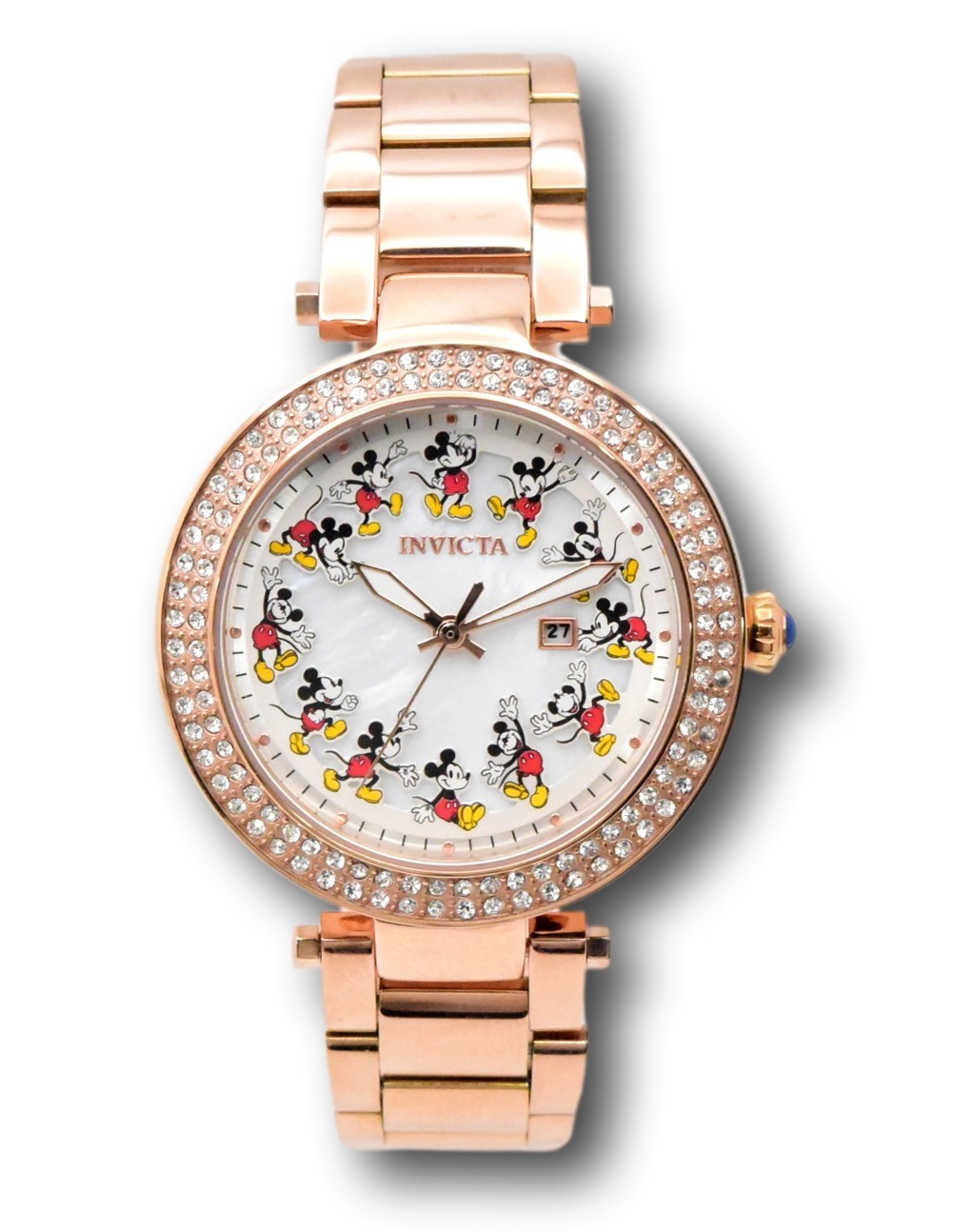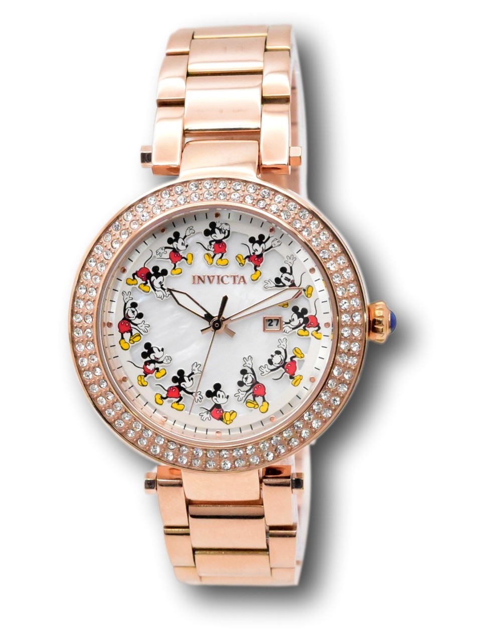 New - With Defects New and Unworn - No box - some small scratches on the watch band and sides of the case - scratches on back of case. Watch is otherwise great condition and 100% functional. Guaranteed Authentic - New battery installed - 100% Functional This listing includes real pictures of the actual watches for sale - Watch features Mickey Mouse on a White mother of pearl dial Limited edition # 0016 / 3000 Case size: 38mm wide or about 41.5 mm wide including the crown Thickness: 11 mm thick - Weight: about 3.9 ounces Items included: None - no box or manuals Max wrist size: 8.0 Inches Case and Dial Case Size: 38mm Case Material: Stainless Steel Bezel Material: Stainless Steel, Crystal Bezel Color: Rose Gold Crown Type: Push Crystal Type: Flame Fusion Dial Material: Mother of Pearl Movement Caliber: PC22A Function Type: Quartz Water Resistance Water Resistance: 100m Band Material: Stainless Steel Tone: Rose Gold Length: 210mm Size: 18mm Stones Type: Crystal Quantity: 120 Size: 1.2MM Color: White