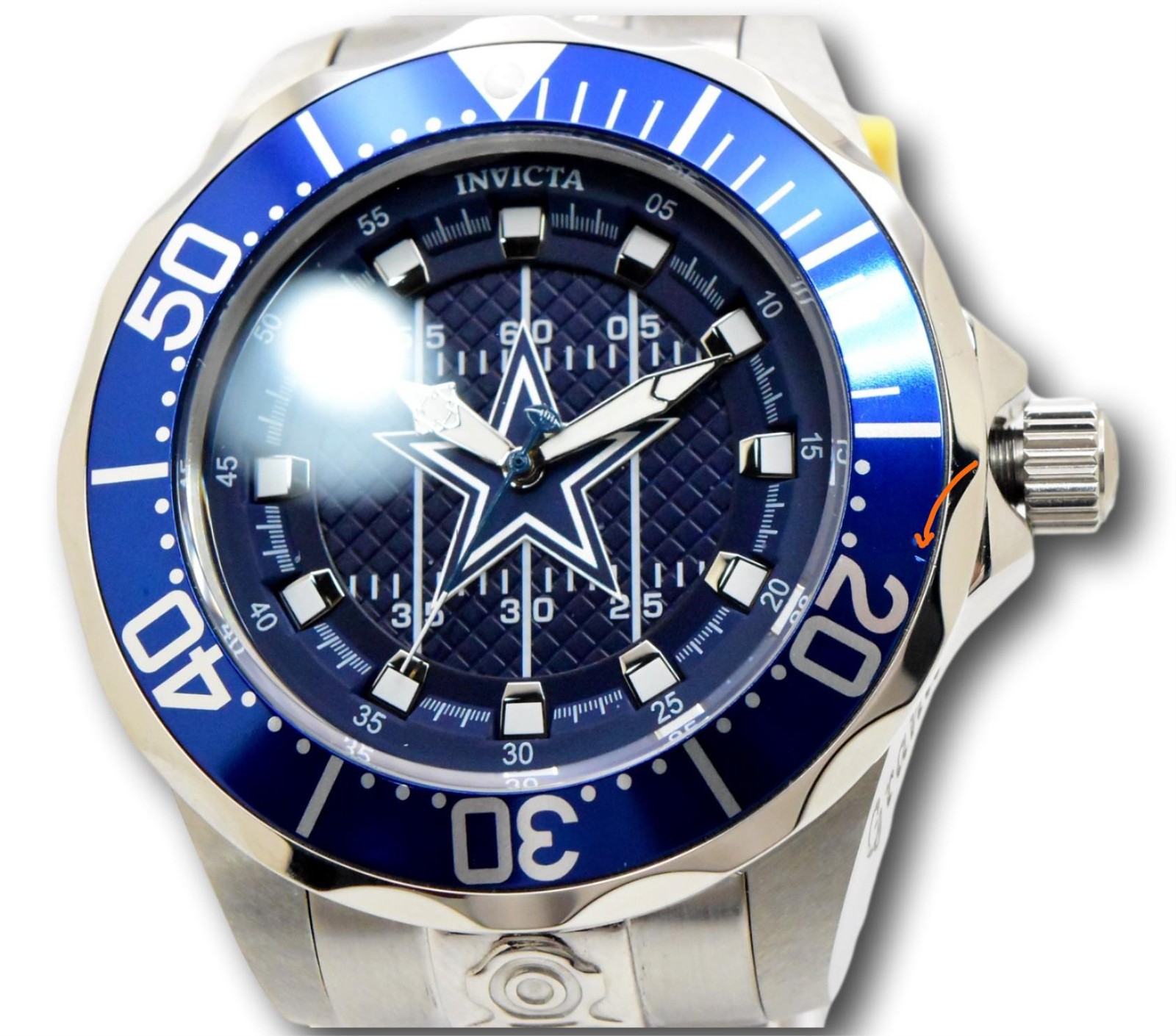 This Invicta Dallas Cowboys watch is a fantastic deal for any fan! Despite the minor bezel imperfection near 4 o'clock, it looks sharp and works perfectly. The 300M water resistance and luminous markers make it both stylish and functional. Comes with the box and warranty—great value for a high-quality automatic watch. Love the bold Cowboys design!