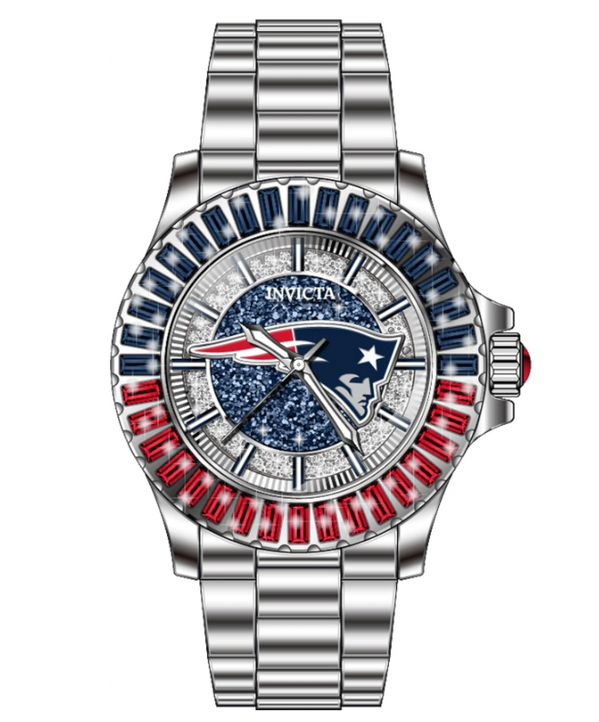 New - With Tags New and Unworn - Guaranteed Authentic - Includes Blue Invicta NFL Box and Warranty Card 100% Functional - This listing includes real pictures of the actual watches for sale These NFL watches are made in limited small batches, and once they sell out are hard to find! Rare and collectible model. Watch features: 96 individual crystals! 36 crystals around the watch bezel, and 60 on the watch dial. Case Size : 38mm or about 42mm wide including the crown Thickness: 12.5 mm Weight: about 4.7 ounces Items included: Blue Invicta NFL Box and Warranty Card Max wrist size: 7.75 Inches Case and Dial Case Size: 38mm Case Material: Stainless Steel Bezel Material: Stainless Steel Bezel Color: Blue, Red, Silver Crown Type: Push Crystal Type: Flame Fusion Dial Material: Metal, Glitter Movement Caliber: PC21J Function Type: Quartz Water Resistance Water Resistance: 100m Band Material: Stainless Steel Tone: Steel Length: 175mm Size: 20mm Stones Type: Crystal Quantity: 17, 19, 54 Size: 1.0MM, 4.0MM Color: Blue, White, Red