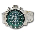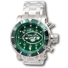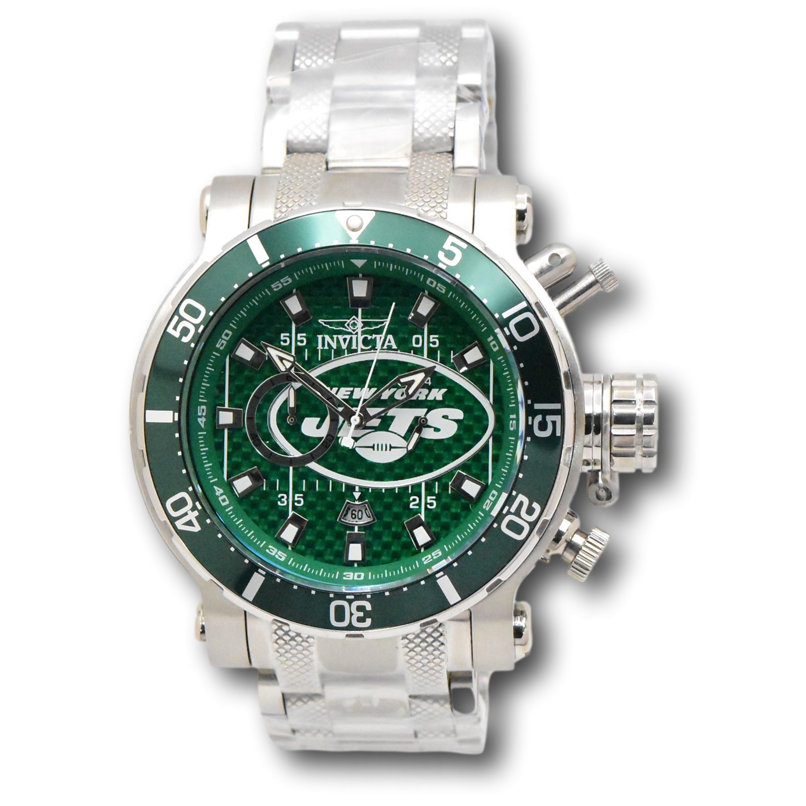 New - With Defects New and Unworn - Missing the small piece that connects the crown guard to the case - just cosmetic - crown guard can be left on or removed - No box or manuals - watch is otherwise NEW and 100% Functional Guaranteed Authentic - Includes Invicta box and warranty info 100% Functional - This listing includes pictures of the actual watches for sale Watch has carbon fiber on the watch dial, very luxurious and sharp looking watch - Quality Japanese chronograph movement - luminous hands and hour markers - rotating bezel - protected crown with 100M Water resistance Limited models - The Invicta NFL watches are made in very small batches - they are hard to find and sell out quickly! Case size: 52mm, or about 60.5 mm wide including the crown - Thickness: 20 mm thick Weight: about 12.1 ounces Items included: None - no box or manuals Max wrist size: 8.5 Inches Case and Dial Case Size: 52mm Case Material: Stainless Steel Bezel Material: Stainless Steel Bezel Color: Green, Silver, White Crown Type: Screw Down Crystal Type: Flame Fusion Dial Material: Metal, Glass Fiber Movement Caliber: VD54 Function Type: Quartz Water Resistance Water Resistance: 100m Band Material: Stainless Steel Tone: Steel Length: 190mm Size: 26mm