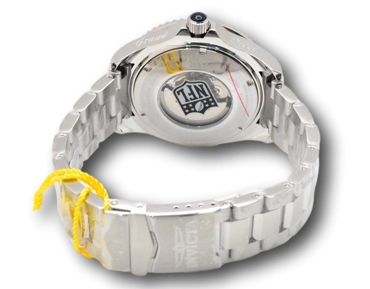 New - With Tags New and Unworn - Guaranteed Authentic - Includes Blue Invicta NFL Box and Warranty Card 100% Functional - This listing includes real pictures of the actual watches for sale Watch features Screw down crown with superior 300M water resistance - luminous hands and hour markers, rotating bezel Limited models - The Invicta NFL watches are made in very small batches - they are hard to find and sell out quickly! Case Size: 47mm or about 52 mm wide including the crown Thickness: 16 mm Weight: about 8.2 ounces Items included: Blue Invicta NFL Box and Warranty Card Max wrist size: 8.5 Inches Case and Dial Case Size: 47mm Case Material: Stainless Steel Bezel Material: Stainless Steel Bezel Color: Dark Blue, Red Crown Type: Screw Down Crystal Type: Mineral Dial Material: Metal Case Back: Exhibition Movement Caliber: NH35A Function Type: Automatic Water Resistance Water Resistance: 300m Band Material: Stainless Steel Tone: Steel Length: 210mm Size: 22mm