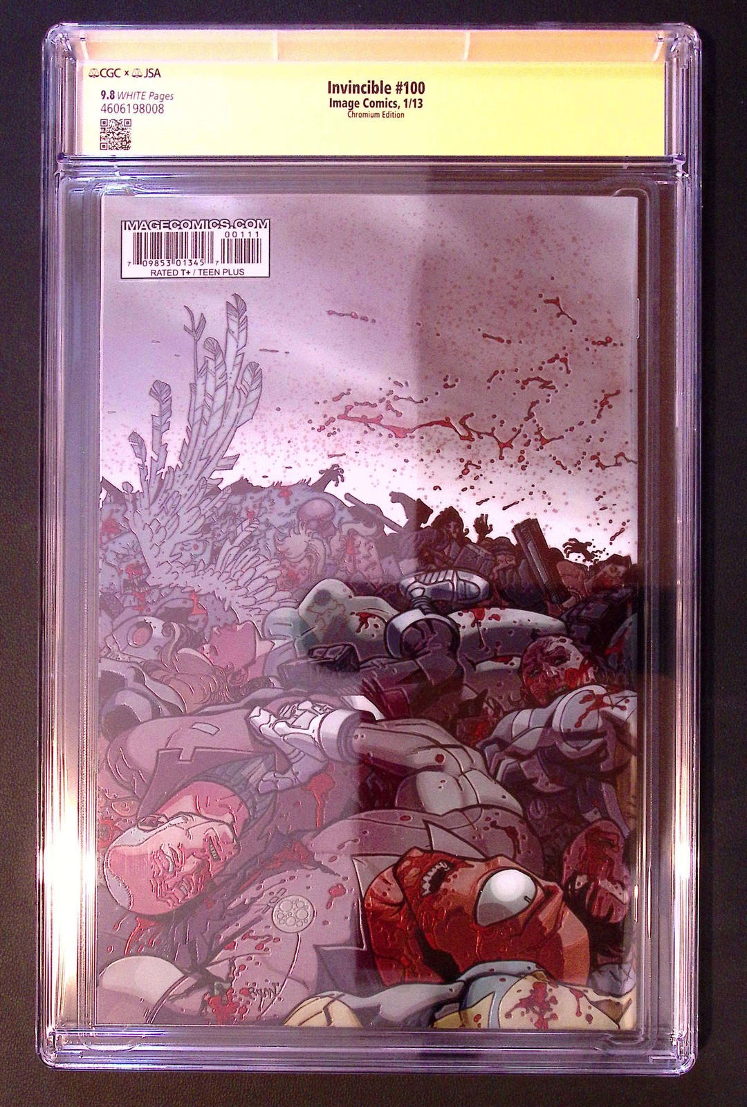 Invincible #100 CGC 9.8 Signed Ryan Ottley Foil Chromium Yellow Label 2013 Key 1 Invincible #100 – CGC 9.8 Signature Series Signed by Ryan Ottley | Foil / Chromium Cover | 2013 A milestone issue from one of the most important modern comic series of the last two decades. This is Invincible #100, professionally graded by CGC at 9.8 (Near Mint/Mint) and authenticated under the CGC Signature Series (Yellow Label). The book is signed by Ryan Ottley, the defining artist of Invincible, and features the striking foil / chromium cover released to mark this landmark issue. With Invincible firmly established as a modern classic and backed by ongoing screen success, issue #100 remains a cornerstone for collectors of Image Comics and contemporary superhero runs. Key Details Title: Invincible #100 Publisher: Image Comics Year: 2013 Grade: CGC 9.8 (Near Mint/Mint) Signature: Ryan Ottley Label: CGC Signature Series (Yellow Label) Cover: Foil / Chromium Key Issue: Milestone Issue #100 Condition Professionally graded and sealed by CGC. Slab is clean, clear, and intact. You will receive the exact item pictured. Why This Book Matters Issue #100 represents a major moment in the Invincible saga and remains highly collectible in high grade, particularly with a Signature Series label. A great blend of display appeal, creator significance, and long-term collectability. Shipping & Packaging Shipped fully tracked and securely packed. Slab will be protected properly from dispatch to delivery. See you in the long box. 🟥📦 Invincible #100 CGC 9.8 Signed Ryan Ottley Foil Chromium Yellow Label 2013 Key 1 Invincible #100 – CGC 9.8 Signature Series Signed by Ryan Ottley | Foil / Chromium Cover | 2013 A milestone issue from one of the most important modern comic series of the last two decades. This is Invincible #100 , professionally graded by CGC at 9.8 (Near Mint/Mint) and authenticated under the CGC Signature Series (Yellow Label) . The book is signed by Ryan Ottley , the defining artist of Invincible , and features the striking foil / chromium cover released to mark this landmark issue. With Invincible firmly established as a modern classic and backed by ongoing screen success, issue #100 remains a cornerstone for collectors of Image Comics and contemporary superhero runs. Key Details Title: Invincible #100 Publisher: Image Comics Year: 2013 Grade: CGC 9.8 (Near Mint/Mint) Signature: Ryan Ottley Label: CGC Signature Series (Yellow Label) Cover: Foil / Chromium Key Issue: Milestone Issue #100 Condition Professionally graded and sealed by CGC. Slab is clean, clear, and intact. You will receive the exact item pictured . Why This Book Matters Issue #100 represents a major moment in the Invincible saga and remains highly collectible in high grade, particularly with a Signature Series label. A great blend of display appeal, creator significance, and long-term collectability. Shipping & Packaging Shipped fully tracked and securely packed. Slab will be protected properly from dispatch to delivery. See you in the long box. 🟥📦 × × × Buy now and save! Shipping info Click the Shipping & Payments tab above the listing description for more info Price: £3.55 (local shipping) Click the Shipping & Payments tab above the listing description for more info! Additional delivery notes PICK UP OPTION Sorry, our items are NOT available for pick-up. PAYMENT Immediate payment is required upon selecting "Buy It Now" or upon checking out through the cart. We accept payment via All Major Credit Cards (Visa, Mastercard, AMEX, Discover), Google Pay, PayPal, & Apple Pay (on mobile & eBay App). Thank you for shopping with us on eBay! Additional Information No additional information at this time Ask seller a question You might also like Mylites2 – Current Size (SUPPLY668) Spawn #1 (1995) CGC 7.5 | South African Edition | 1st App Mylites2 Standard Size (SUPPLY678 The New Mutants #98 CGC 8.5 Newsstand WP (Marvel 1991) 1st Appearance Deadpool Contact To contact our Customer Service Team, simply click the button here and our Customer Service team will be happy to assist. Ask seller a question © Redsters Comics Shipping & Payments Shipping is a flat rate across GB at a rate of £3.55 Payment Accepted Payment Methods Immediate payment is required upon selecting "Buy It Now" or upon checking out through the cart. We accept payment via All Major Credit Cards (Visa, Mastercard, AMEX, Discover), Google Pay, PayPal, & Apple Pay (on mobile & eBay App). Thank you for shopping with us on eBay! Returns Returns are accepted Items must be returned within 30 days of the auction ending Buyer will pay for return shipping. eBay integration by