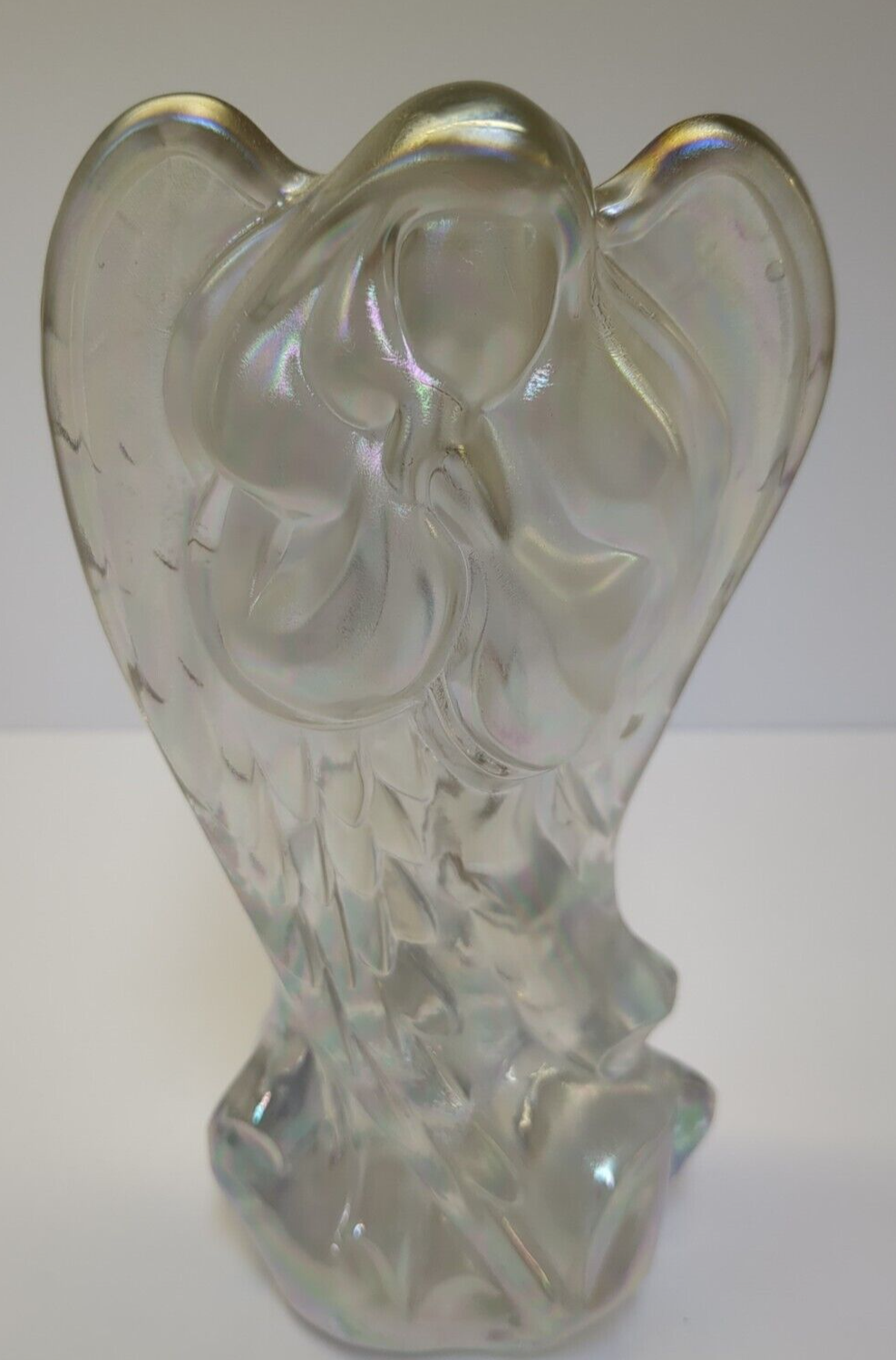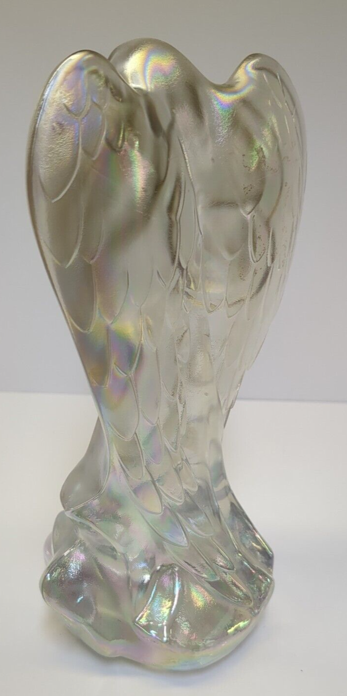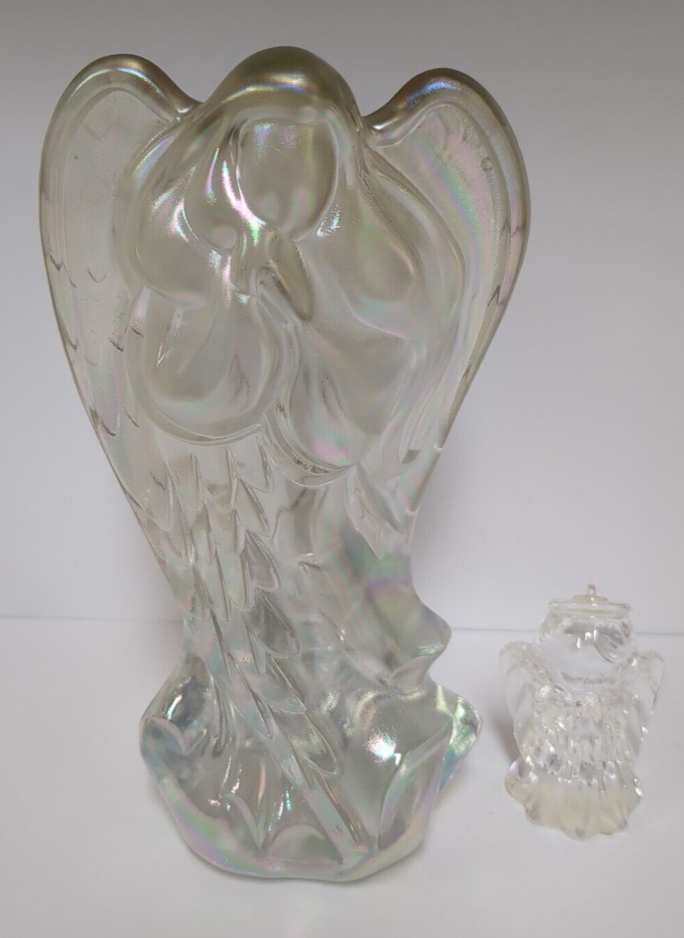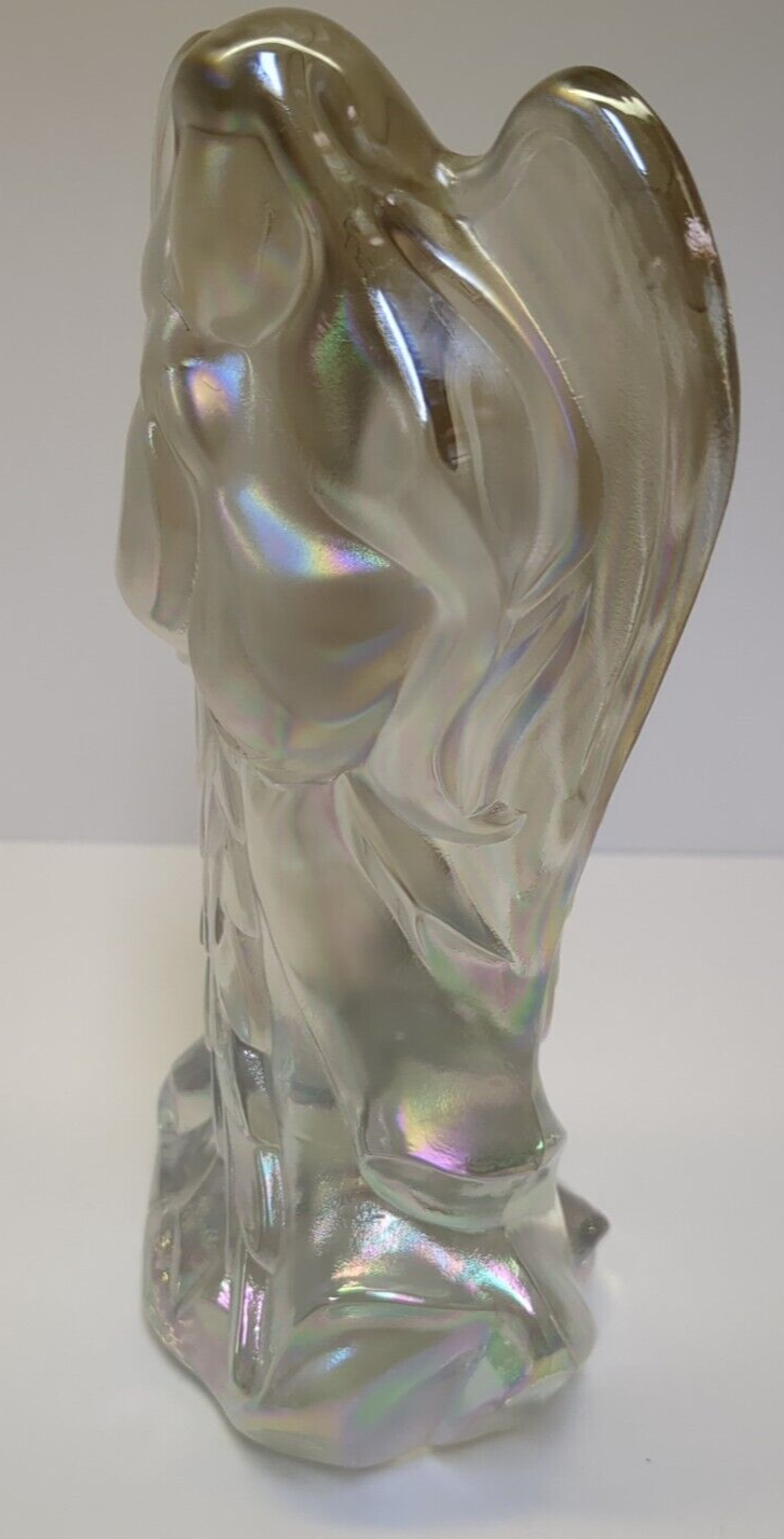 With this listing you get two beautiful angels. I believe the large angel to be Fenton but am not certain. It has a beautiful iridescent satiny finish and stands at 7.5 inches high and is a solid piece. The smaller praying angel is from Waterford and was made in Germany and is 5.25 inches tall. They are both lovely pieces and would make a nice addition to your home. I believe both of them to have been manufactured in the early to mid 90s based on the age of the other items they were packaged with, but also am not certain of that.