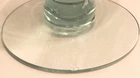 This set of 4 light blue glass footed water goblets have an iridescent pink ring below the bowl. Each is 6 3/8" tall with a 3 1/2" top diameter and a 3 1/8" base diameter. One has a small smooth chip on the base.