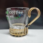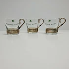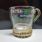 Irish Cofee Whiskey Vintage Glass Mugs Metal Holder-Handle St Patrick's Barware. Inspired by Muphy's whiskey. Set of three. Condition is used, in very good vintage condition. Some minor surface wear due to age and storage. Hold 6 ounces. Metal holders are keyhole design popular in the 1960's. See all photos and this description for overall condition and design. Shipped with USPS Priority Mail.