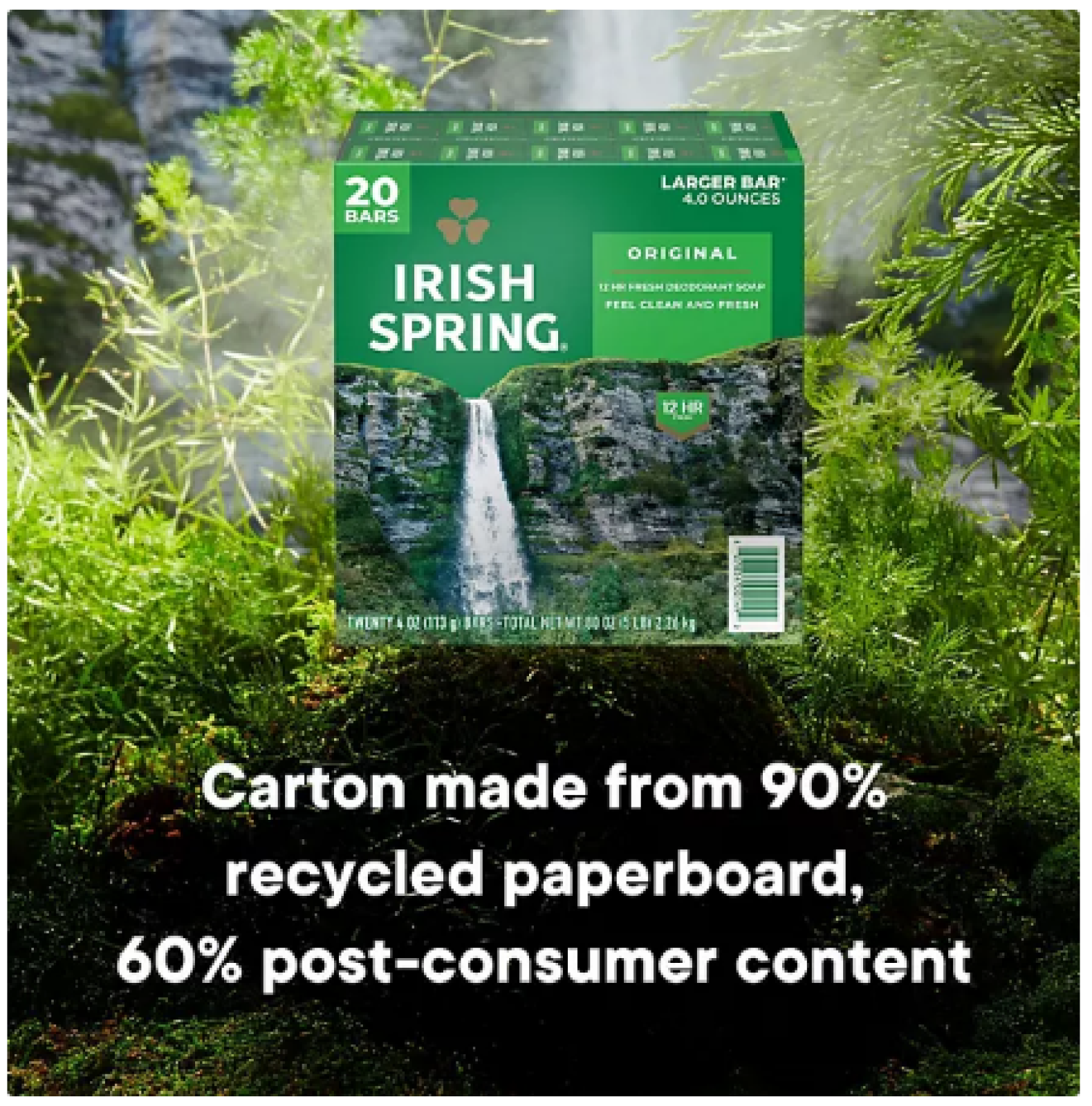 Irish Spring Bar Soap, Original Clean, 4 oz., 20 ct. Description: Smell like you came from a nice-smelling place with Irish Spring Bar Soap. Count on Irish Spring Original Bar Soap to leave your skin feeling clean — our original bar soap for men is made with a 98% naturally derived formula that keeps you fresh for 12 hours. Irish Spring Original Bar Soap has a sudsy lather that washes away bacteria, so you can use it as a hand soap bar and keep the fresh smell going all day long. Plus, this soap bar is mild for skin. It's paraben, phthalate and gluten free and has flaxseed oil. Feel good while washing from head-to-toe with Irish Spring. Specification: Irish Spring Bar Soap in new larger size bars (4 oz. vs. 3.7 oz.) This bar soap for men is mild for skin Sudsy lather