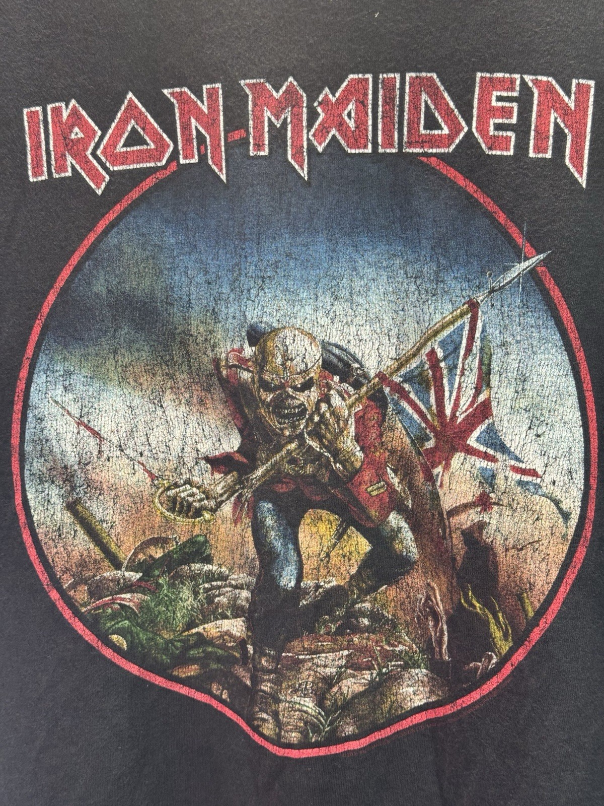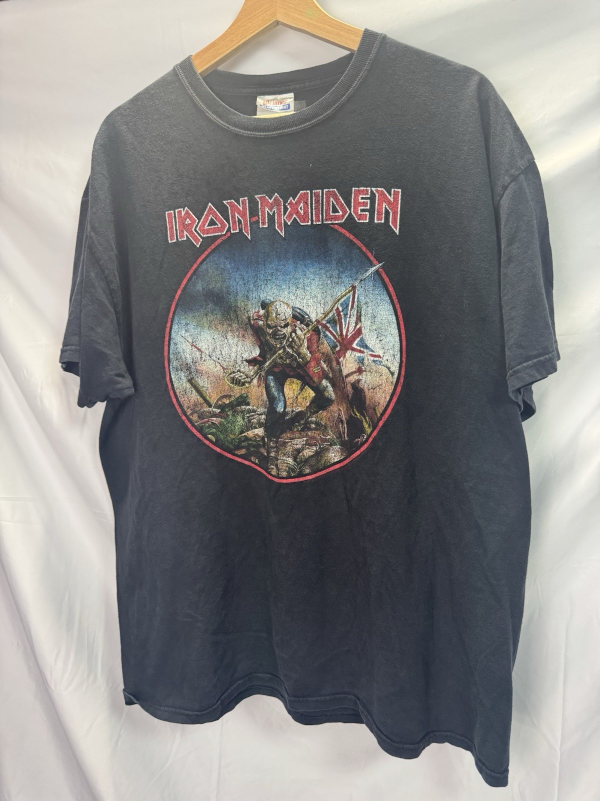 This vintage Iron Maiden Band Tee in size XL features a graphic print of Eddie the Trooper, perfect for fans of the legendary band. Made from 100% cotton with a crew neck and short sleeves, this black shirt is machine washable and suitable for all seasons. The regular fit and classic design make it a staple piece for any music lover's wardrobe, representing the grunge theme of the 1990s era. This heavyweight shirt from the Free! character family origins from El Salvador is a must-have for collectors and enthusiasts alike.