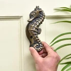 PRODUCTE DESCRIPTION: Rugged Design and Texture- To reduce wear and tear, these knockers are made of brass and iron, which gives a solid texture to the knockers. This solid texture, combined with an engraved design, made your door stands out and affixed to the fine detailing. Ease of Installation- You can quickly install them using screws and a driller rather than calling an electrician to install the electric bell. This feature of knockers makes them a go-to product for door decoration. Highly durable- Not only do these knockers complement the design of the door, but also they are highly resistant to corrosion and changing weather like cold and rain. Supplement eminence of Door- Knockers made at Indianshelf have royal designs and sturdiness, making them distinct from others. So, Install these door accessories to maintain the extravagance of your house. Sea Horse Knockers Size: Height- 15 Cm, Weidth- 6.35 Cm Projection- 15 Cm Approx. NOTE: Custom duty charge paid by the buyer.