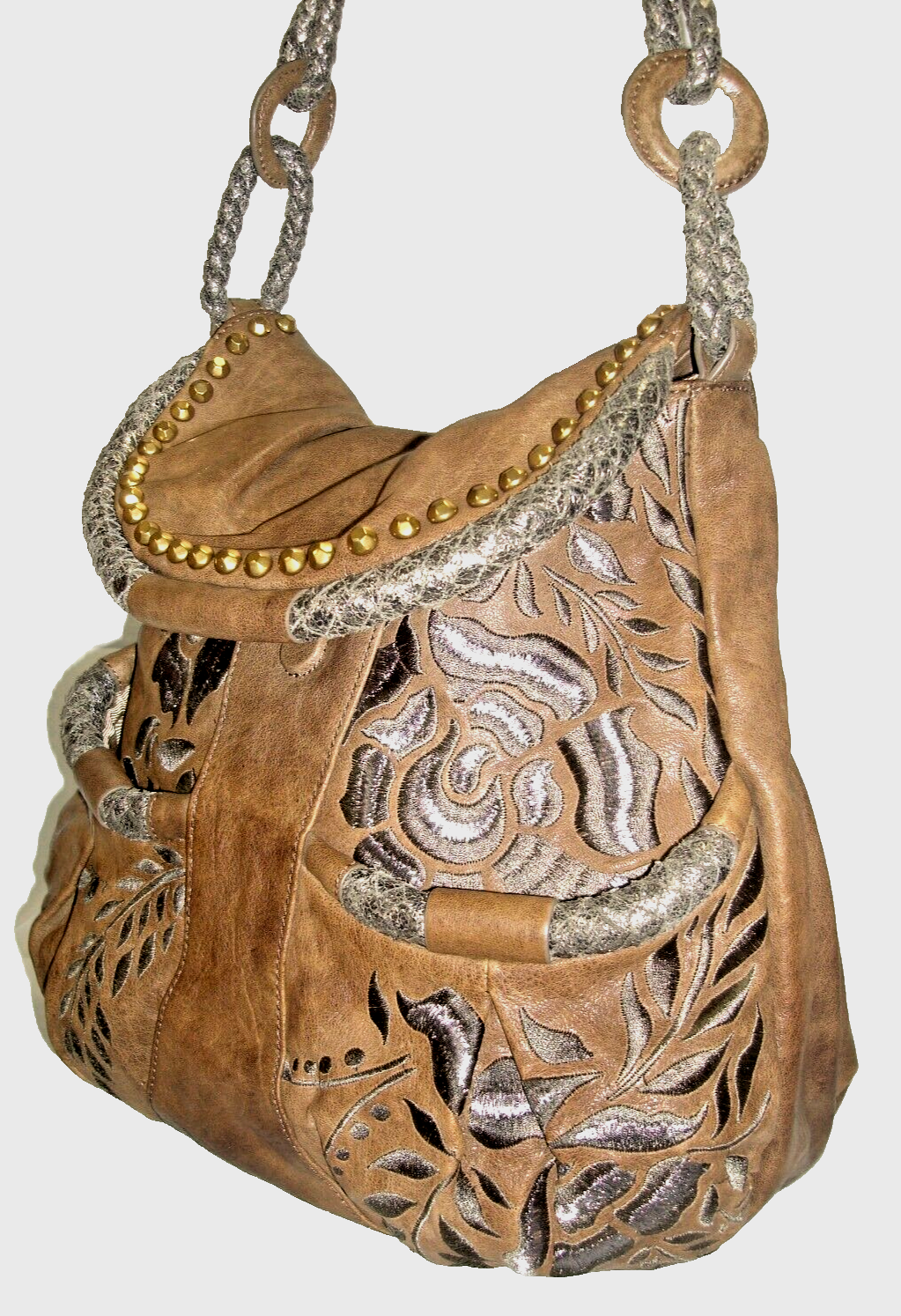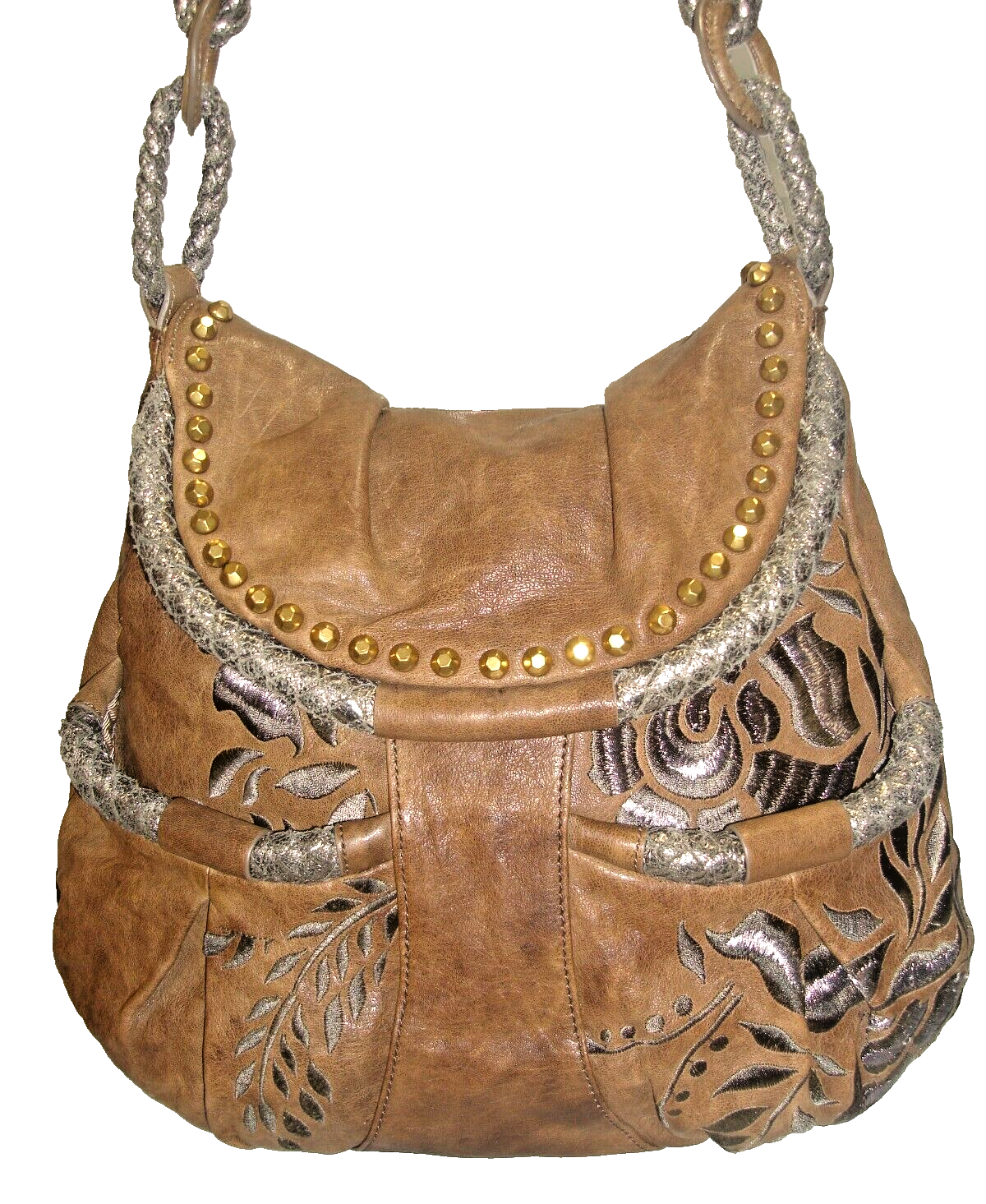 Gorgeous Isabella Fiore Large Brass Studs, Embroidered Stems & Leaves, and Woven Silver Metallic Leather Detail Brown Leather Hobo Shoulder Bag is in Excellent Used Condition and Comes in a Brand New Silky Fabric Protective Dust Bag ! Please see above the Item Specifics for the measurements, features, and all other details for this amazing bag that is stunning and stylish, classy and a real catch -- so DON'T MISS IT!!! Please note the colors of this bag are listed according to my opinion. Please note all photos are part of this bag's description so look carefully! Please also note that color will vary from Actual to Photograph and from Computer to Computer. And lastly, please note that bag size and condition are subjective and labeled according to my opinion. Please see dimensions and Photos above. Please note that colors will appear lighter than actual due to camera flash. Please message me if you have any questions or concerns.