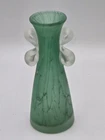 This Israeli Glass Satin Green Bud Vase features an abstract asymmetrical shape with frosted handles, hand-blown from green satin glass in Israel during the 1950s. Standing at 6.5 inches tall, this small vase showcases a unique artistry that makes it suitable for all occasions. With its mid 20th-century origins and original handmade construction, this piece exudes a vintage charm perfect for collectors or those appreciative of abstract art.