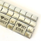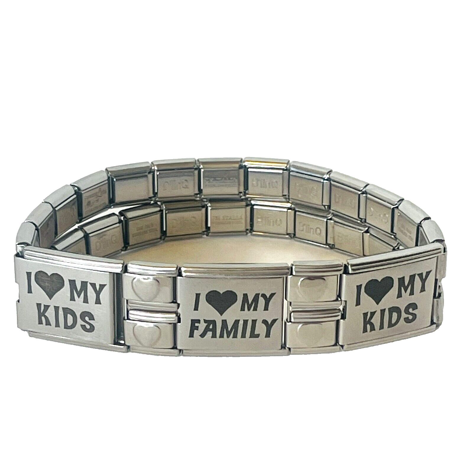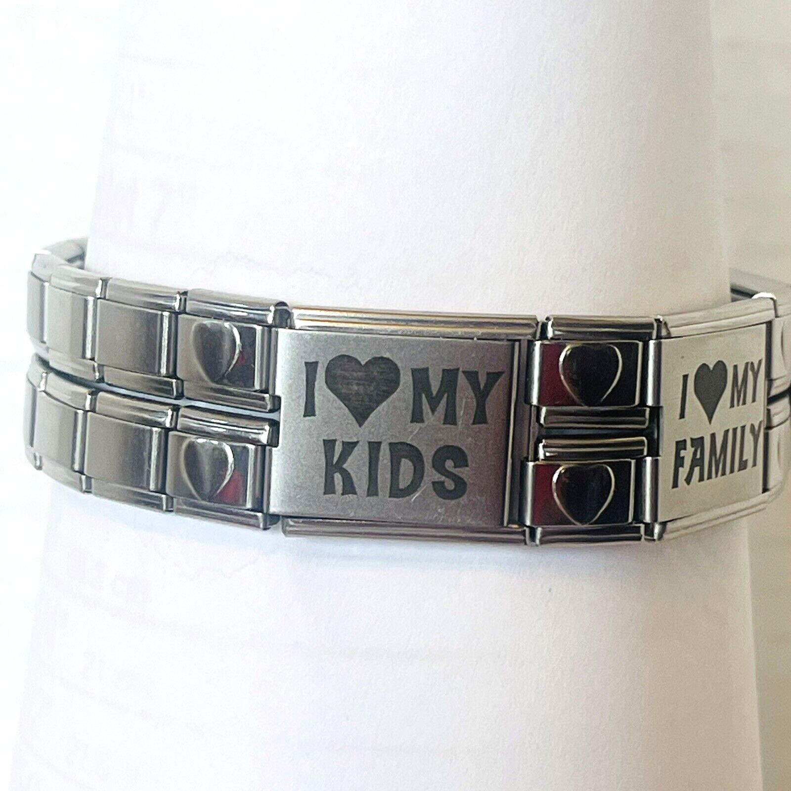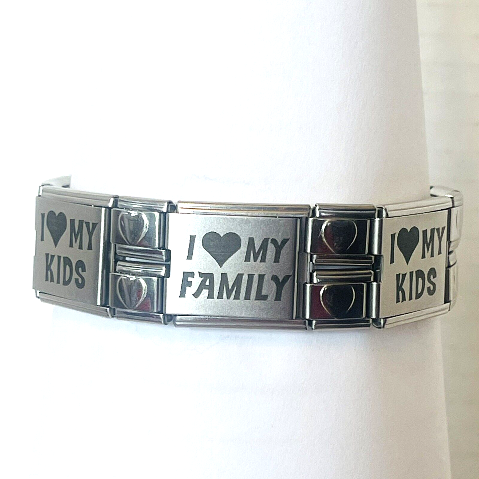 Nice family themed Italian charm bracelet made with a combination of 9mm & 18mm stainless steel links. Bracelet incorporates 2-18mm charms that read "I Love (heart) My Kids" and 1-18mm charm that reads "I Love (heart) My Family". All 3-18mm charms are B'linQ brand. Bracelet also includes 8 links that feature a heart in the center. They are unbranded and 9mm in size. 20 plain silver tone links finish off the bracelet and they include both B'linQ & D'linQ brands (14-B'linQ & 6-D'LinQ). You get a total of 28-9mm charms and 3-18mm charms that you can use to redesign bracelet and / or work with to create different looks. Bracelet would make a nice gift. This Italian charm bracelet is in good condition with very light wear. May need cleaning from storage. You get the exact bracelet shown photos. Please examine photos before purchasing. See photos. Zoom for more detail and assessment of condition. Feel free to contact me with questions. I will create custom bundles & give discounts for purchases of more than one item/listing + combine shipping for extra savings. Quotes provided on request. All sales are final. Returns are not accepted; however your satisfaction is important to me. Please reach out if there is a problem with your purchase. Thanks! PassionatelyCollected I passionately collect things.....