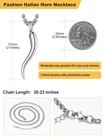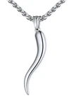 Description Amulet Cornicello Horn Necklace Lucky Italian Horn Pendant Jewelry for Men and Women. Protection charm for men women or hang on the car. An Italian horn, as an amulet and a talisman, popular among Italian and American. Ward off evil, and protect the person in question Pendant length : 2 inches, chain length : 22"+2 inches extender. Material - 316L Stainless Steel made, polished finish, hypoallergenic and nickel free. Inspirational present to mom, lover, friend, family to honor them and protection them from bad luck, or give it to yourself, hang it on your car. Necklace comes with U7 design box and a black velvet pouch.