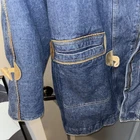 The J. Berry Size M denim coat is a vintage and rare piece perfect for casual occasions in the winter and fall seasons. This mid-length jacket features a solid blue color with a fleece lining for added warmth and comfort. The toggle buttons and button accents add a stylish touch to this classic field barn chore style coat, making it a unique addition to any wardrobe.
