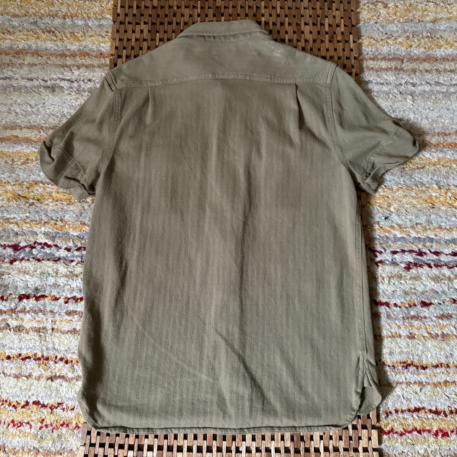 The J. CREW Wallace & Barnes Short Sleeve Button Down Work Shirt in green is a versatile and stylish addition to any man's wardrobe. Made from comfortable cotton fabric, this shirt features a classic collared neckline with a button-down style closure. Perfect for casual occasions, this shirt can be easily machine washed for convenience. The solid green color makes it a timeless piece that can be worn year-round, whether it's for work or leisure. With its quality construction and timeless design, this shirt is a staple item for any man looking to elevate his everyday style.