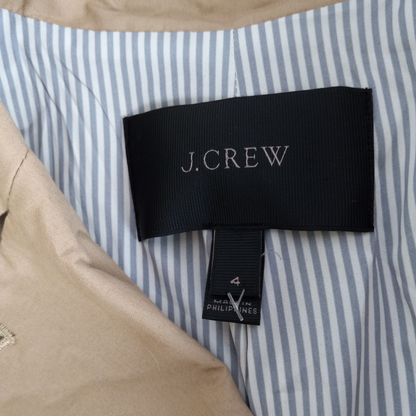Crafted for the modern professional, this J.Crew Double Breasted Blazer is a versatile addition to your wardrobe. The classic tan color and solid pattern make it an ideal choice for business meetings, travel, or casual office wear. Its short jacket/coat length paired with a three-button front style offers a sleek, tailored fit that flatters a size 4 frame. Functionality meets style with features like a fully lined striped interior with 100% polyester lining for comfort, convenient pockets for essentials, and a touch of stretch for ease of movement. Whether you're dressing for fall, spring, or winter, this blazer is machine washable and ready to complement your everyday and career ensembles.