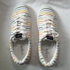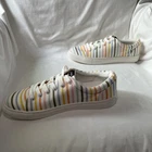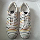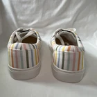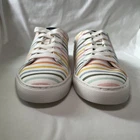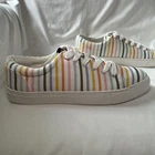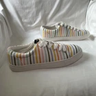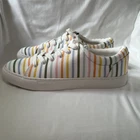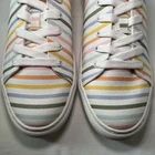 Elevate your casual wardrobe with these J.Crew canvas sneakers. The colorful rainbow stripe design adds a fashionable touch to any outfit, while the lace-up closure ensures a comfortable fit. These sneakers feature a low-top shoe shaft style and a cushioned insole for added comfort, making them perfect for summer, fall, and spring. The synthetic outsole material provides durability, and the canvas lining material and upper material add a classic touch. These sneakers are part of the J.Crew Printed Road Trip Sneakers product line and come in a women's size 9M. Add these stylish and comfortable sneakers to your collection today! New without box.