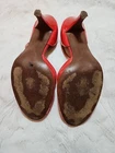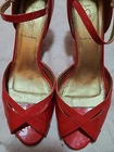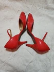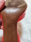 Nice condition women's J Crew coral patent faux leather strappy stiletto heels with ankle straps. Some wear to insoles at the creases, and on heels. Chip on right heel, see pics.