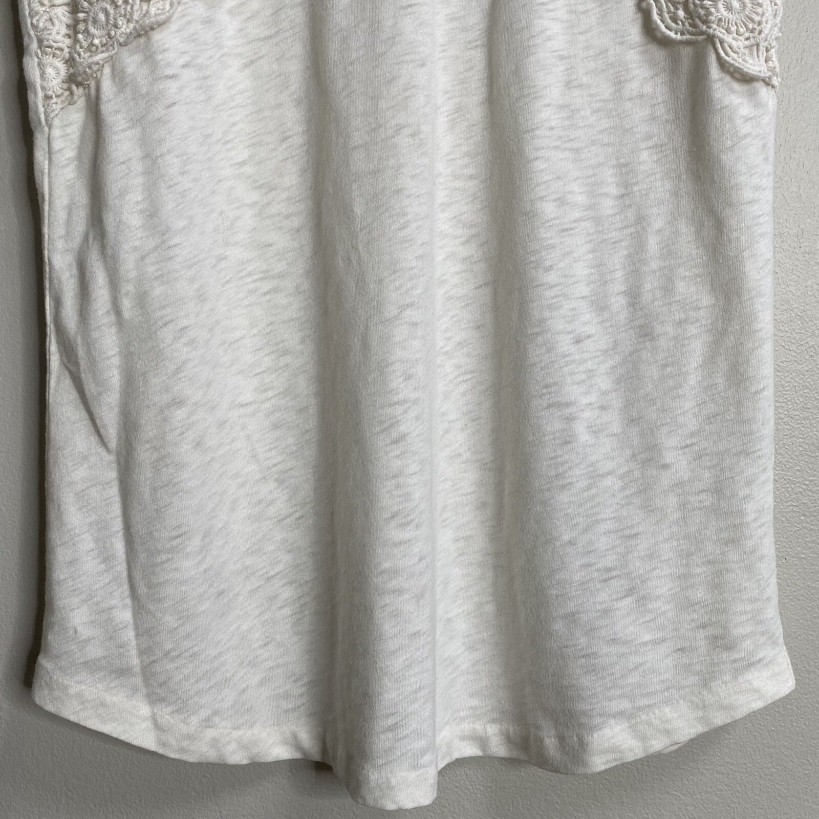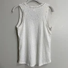 Ivory white color. Crochet lace accented trim. Lightweight, slub knit construction. Scoop neck. Sleeveless. Racerback. Pullover. Size Extra Small Measures Flat Approximately: 16" Pit to Pit, 25" Long 60% Cotton / 40% Polyester Upper Front Sides: 100% Polyester Lace: 100% Cotton Machine Washable **This top is preowned, and shows normal, light wear! No stains or holes! There are a couple of tiny pulls due to the nature of the fabrication! SEE PICTURES for example! Great Condition!**