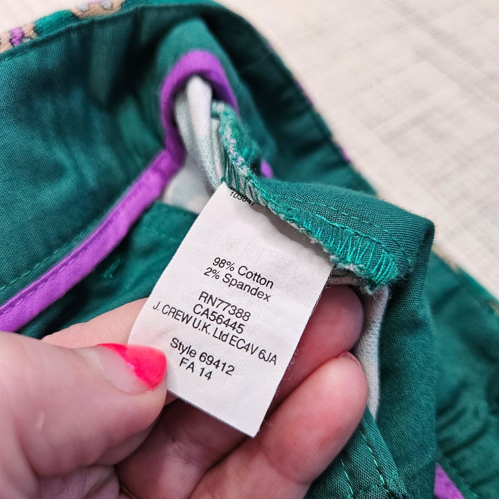 A pair of J. Crew stretch cropped pants featuring a vibrant floral print. These pants offer a comfortable and stylish fit with a classic design. The pants are designed with a flat front and a zip fly with hook-and-eye closure. The fabric is a blend of cotton and spandex, providing a slight stretch for added comfort and flexibility. The pants are fully lined with a purple trim on the inside of the waistband. Style number 69412 FA 14. Style: Cropped Color: Green Department: Women Type: Pants Material: Cotton, Spandex, Cotton Blend Leg Style: Straight Fabric Type: Twill Features: Stretch, Pockets, Lined, Comfort, Lightweight Closure: Zip, Hook & Eye Pattern: Floral Occasion: Casual, Business Keywords: J. Crew, floral print pants, cropped pants, stretch pants, size 6, green pants, pink floral, womens pants, casual pants, dress pants, cotton blend, flat front pants, lined pants, designer pants, classic style Excellent Pre-Owned Condition