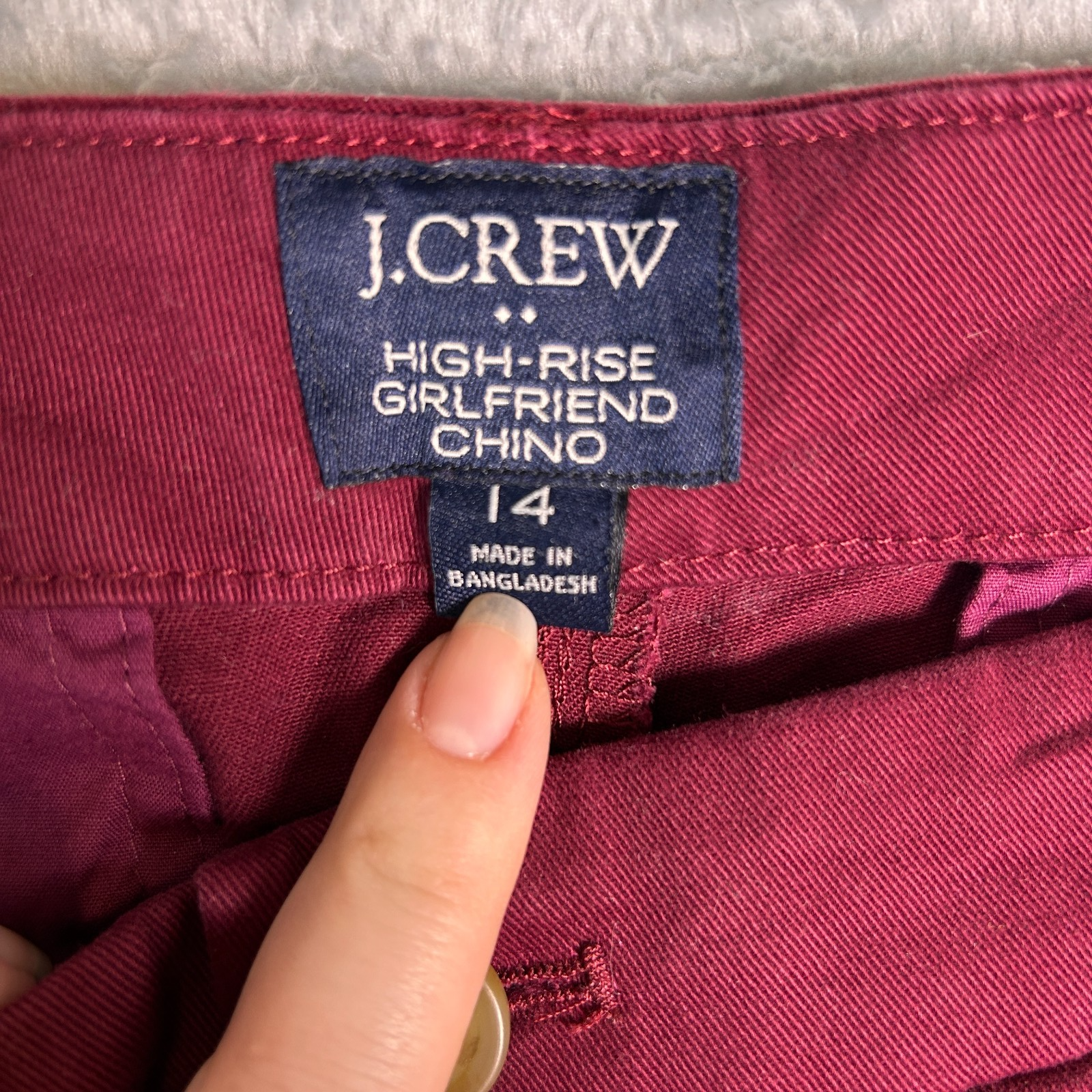 J Crew High Rise Girlfriend Chino Womens 14 Burgundy Straight Leg Elevated Basic Condition: White marks on back right pocket area and several other areas. Possibly fixable but unsure. (Price reflects this). Otherwise, in excellent condition. Effortlessly refined, these J.Crew High Rise Girlfriend Chinos in a rich burgundy hue bring modern polish to any wardrobe. Designed with a straight-leg silhouette and soft cotton twill fabric, they strike the perfect balance between comfort and structure. Perfect for elevated everyday wear — style them with a tucked blouse or cozy knit for a timeless, chic look. classic, preppy, minimalist, capsule wardrobe, versatile, tailored, autumn, modern, structured, workwear, smart casual, sleek, sophisticated, timeless, polished, essential, fall fashion, quality basics, effortless style, wardrobe staple