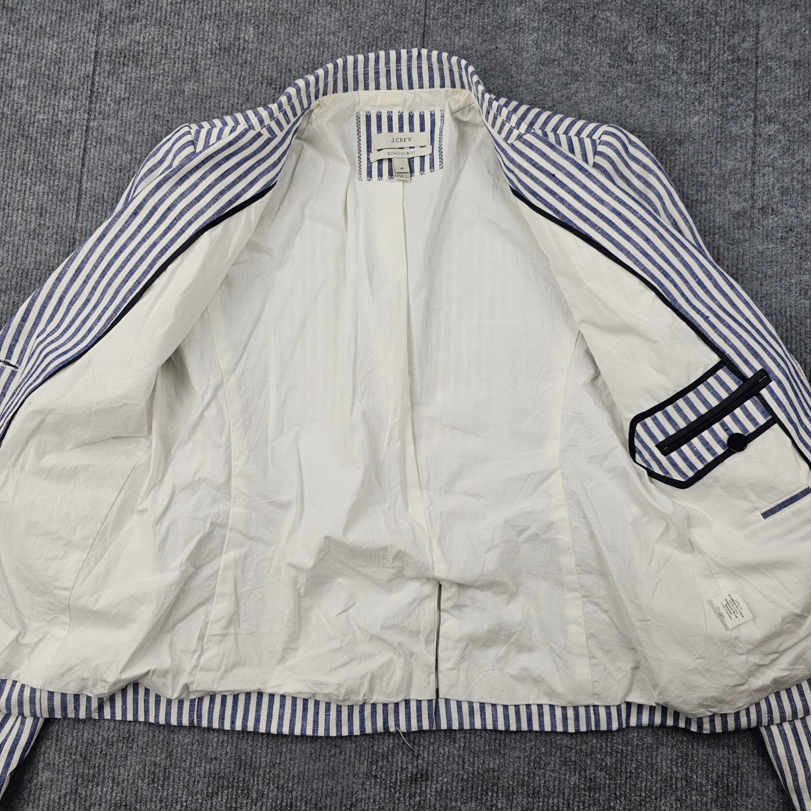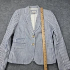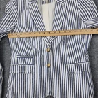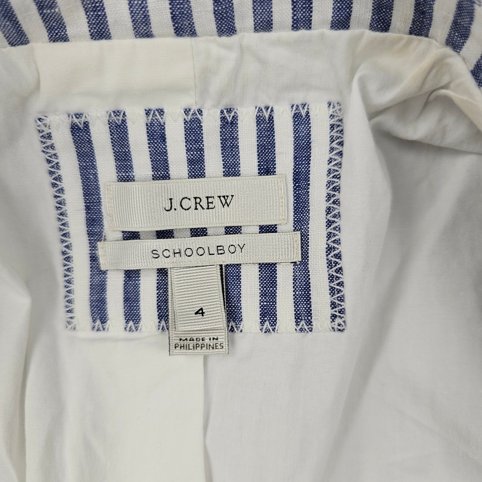 Brand: J.Crew Style: Schoolboy Blazer Department: Women Size: 4 Color: White with Blue Stripe Material: 100% Linen Outer / Body Lining 100% Cotton / Sleeve Lining 100% Polyester Features: Gold tone buttons, striped, lined, tailored Condition: Pre-owned – excellent overall, no major flaws noted Closure: Button front Pattern: Vertical Stripe Made In: Philippines
