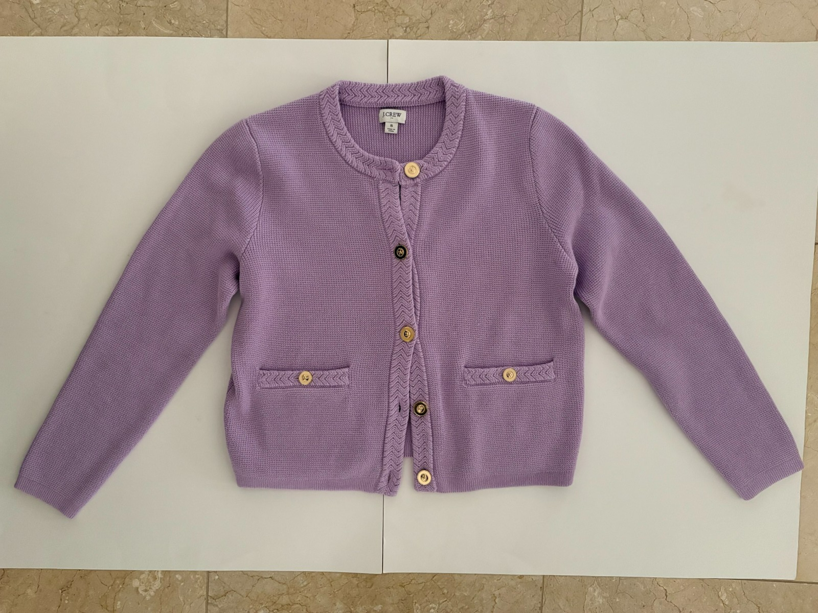 The J. Crew Women's Cotton Lady Jacket Sweater in size small is a stylish and versatile piece of outerwear. Made from solid purple cotton with a tight-knit fabric type, this sweater features a round neck, long sleeves, and button accents. Perfect for a casual or dressy look, this cardigan also includes pockets for added functionality. The J.CREW brand ensures quality and a regular fit, making it a great addition to any wardrobe.
