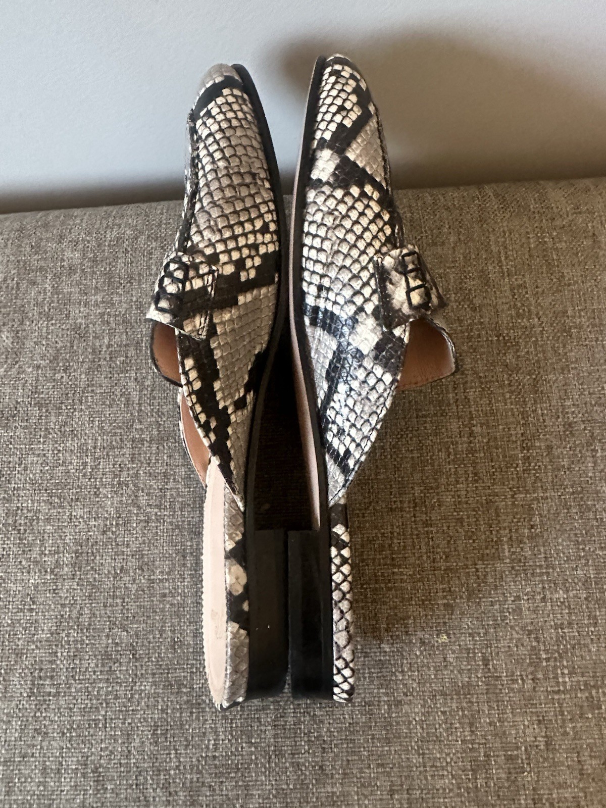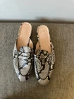 The J Crew Women’s Snakeskin Mule Loafers in size 10 are stylish and versatile flats perfect for casual or business occasions. Featuring an almond toe shape and slip-on closure, these loafers are made of leather with a comfortable leather lining and insole. The multicolor snakeskin design adds a trendy touch, while the leather outsole ensures durability. The breathable design and M width make them a practical and fashionable choice for women looking to elevate their footwear collection. Preowned Good condition