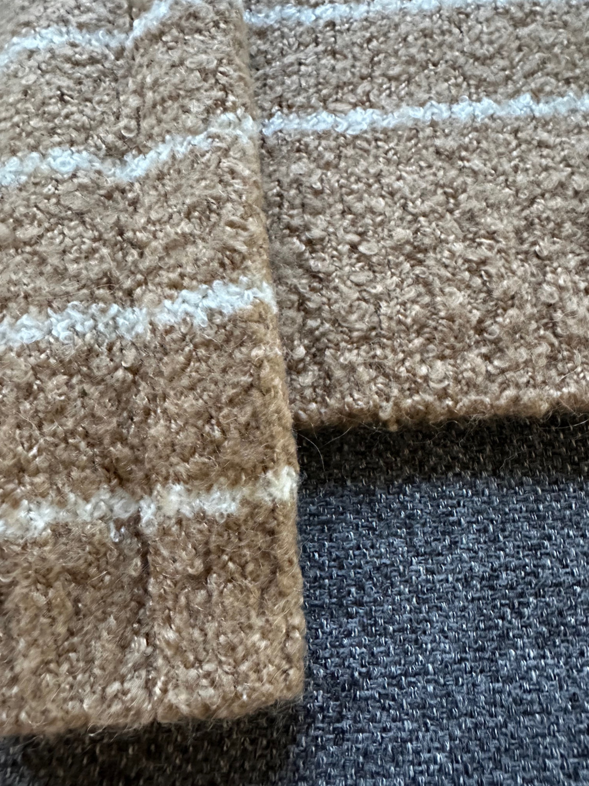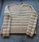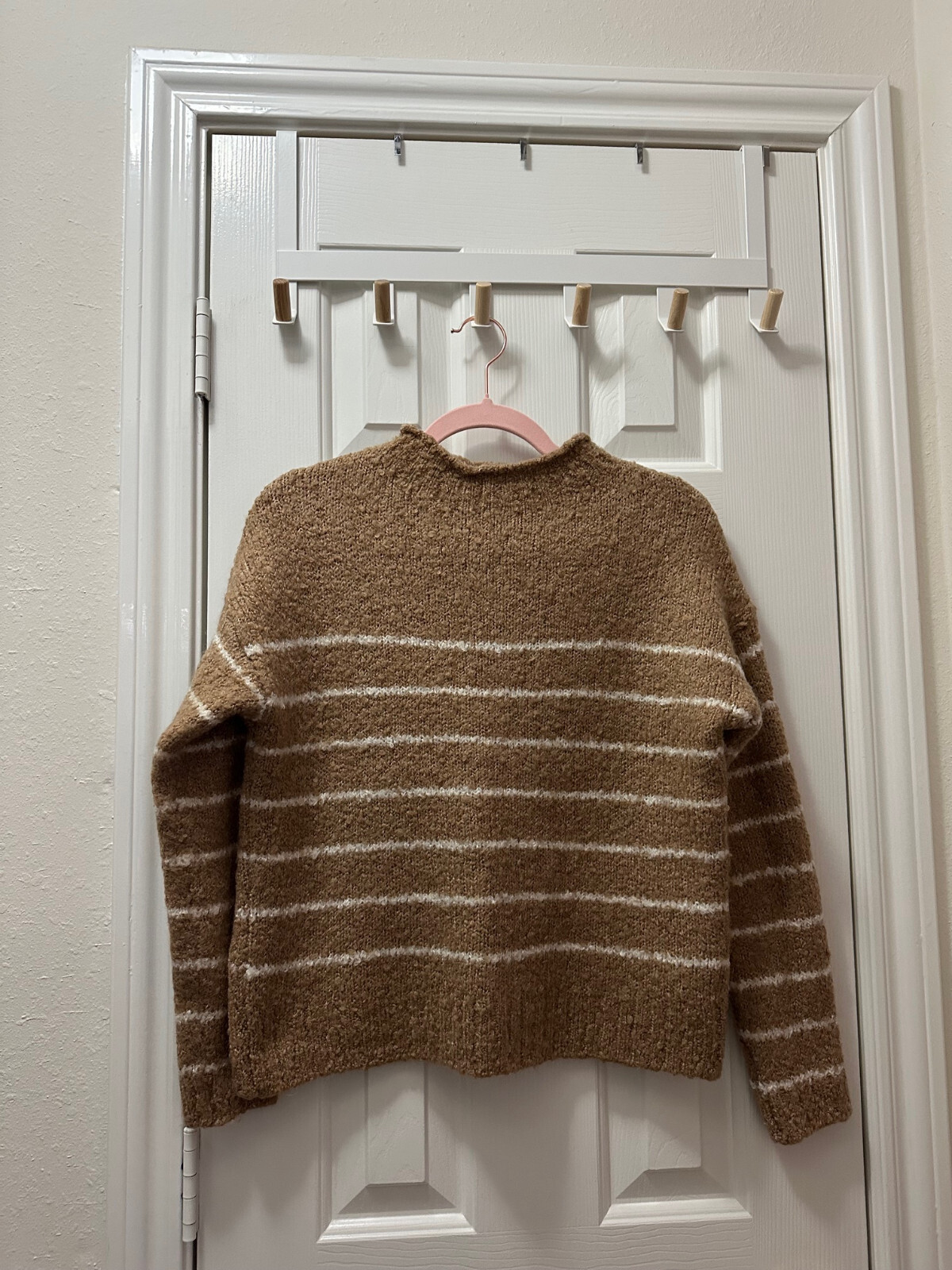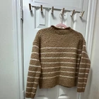 This pullover sweater from J. Crew is slightly thick, perfect for fall or winter. Enjoy its cropped design in brown/beige and white stripes. It comes with long sleeves and a mock neck collar. Pair it with your favorite jeans, skirt, or pants, accessorize, and style away. Like new. ALL SALES FINAL. No return or exchange.