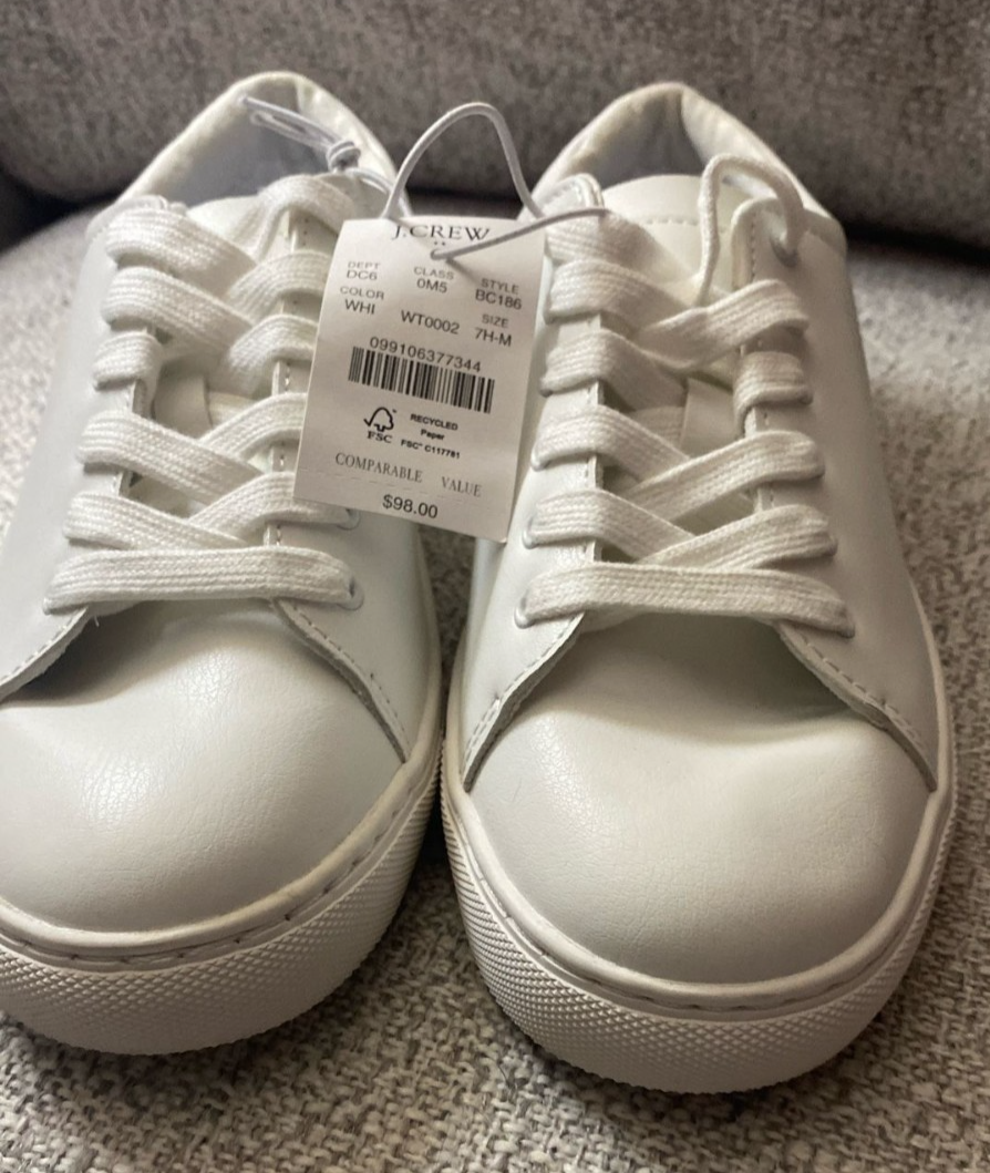 The J. Crew white leather road trip sneakers are a stylish and comfortable option for women in size 7.5. Made with quality leather material, these sneakers boast a clean design that is versatile and perfect for everyday wear. The white color adds a classic touch to any outfit, making these athletic shoes a great addition to any wardrobe. Flaw on bottom of left shoe, pictures show a faint number 6 drawn on bottom of shoe.
