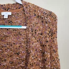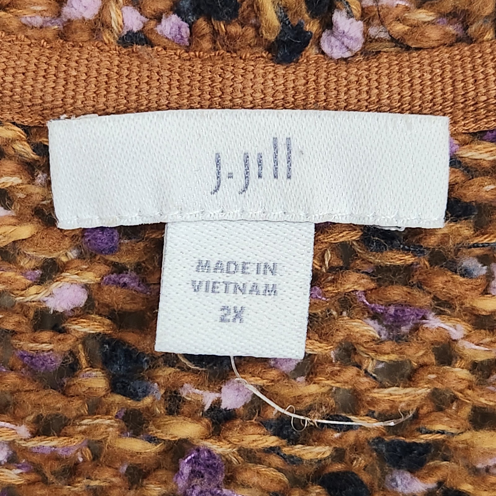 Women's J. Jill carmel-colored chunky knit open front cardigan sweater w/ purple confetti balls, size 2X. Garment is in very good preowned condition with no holes, stains or tears. May be some light pilling. Measurements are approximately 31" in length and 27" across the chest. Material content is 60% cotton/28% polyester/12% acrylic. **Please note that the stock photo is not an exact match on the details, but just to give an idea of the look & fit of this garment. For details of how the garment looks, please check out the actual item photos.**
