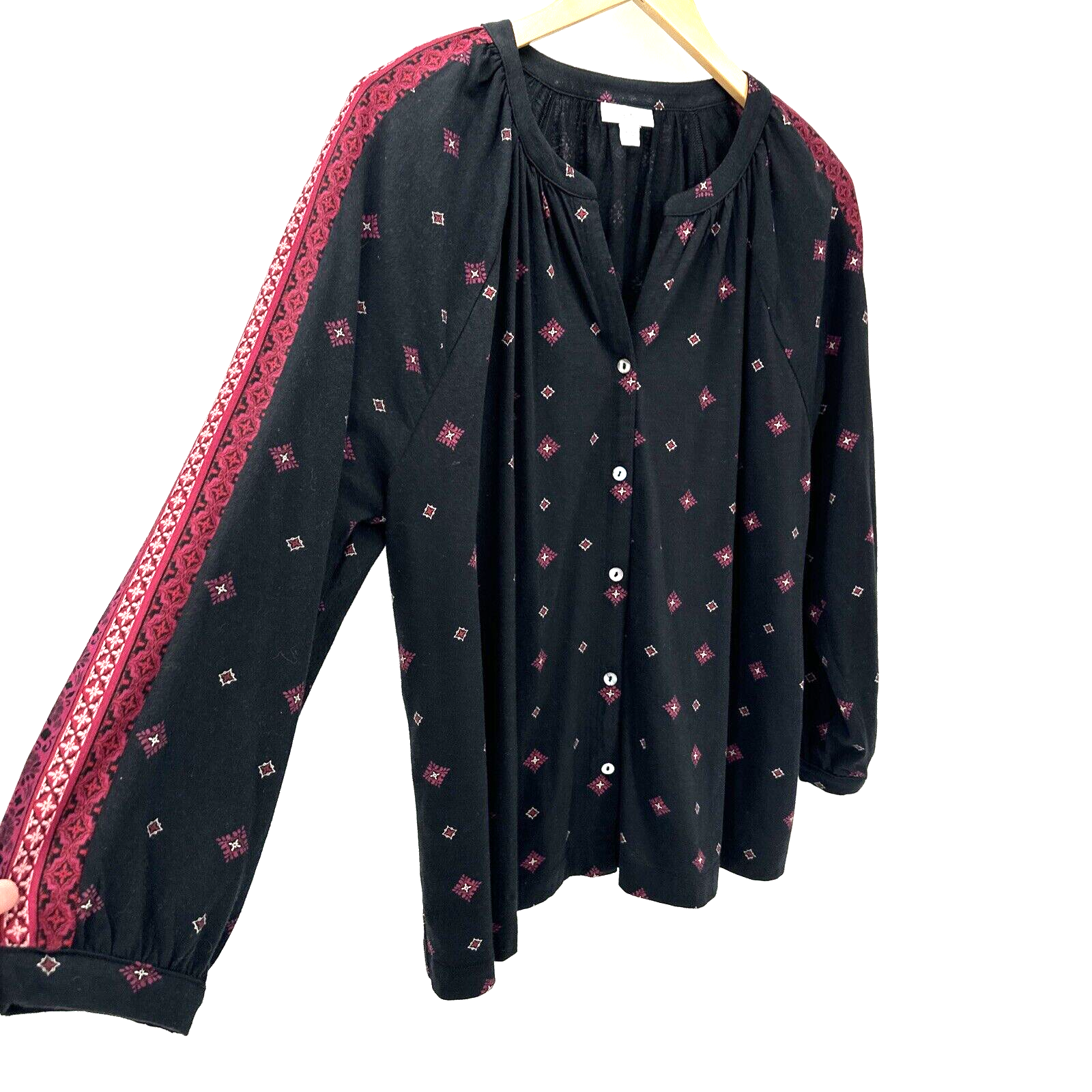 J Jill Blouse Women's Size XL Long Sleeves Button Up V-Neck Black Burgundy Geometric 100% Cotton Boho Boxy Fit Very good condition, see all pictures for views. * Pit to pit: 24" * Shoulder to hem: 25" Ships out same day or next open postal day. Thank you for your purchase, we appreciate you!