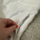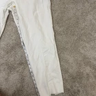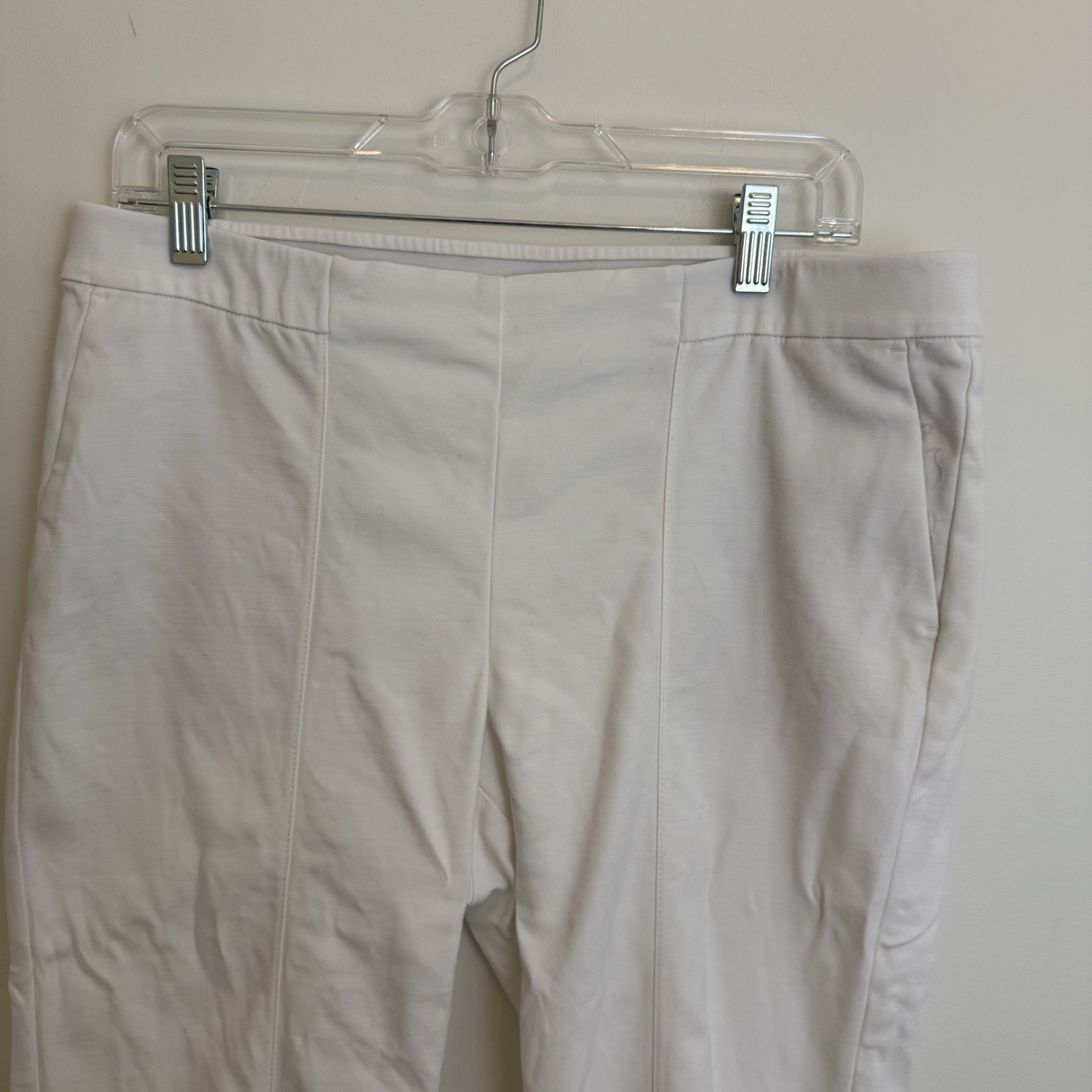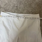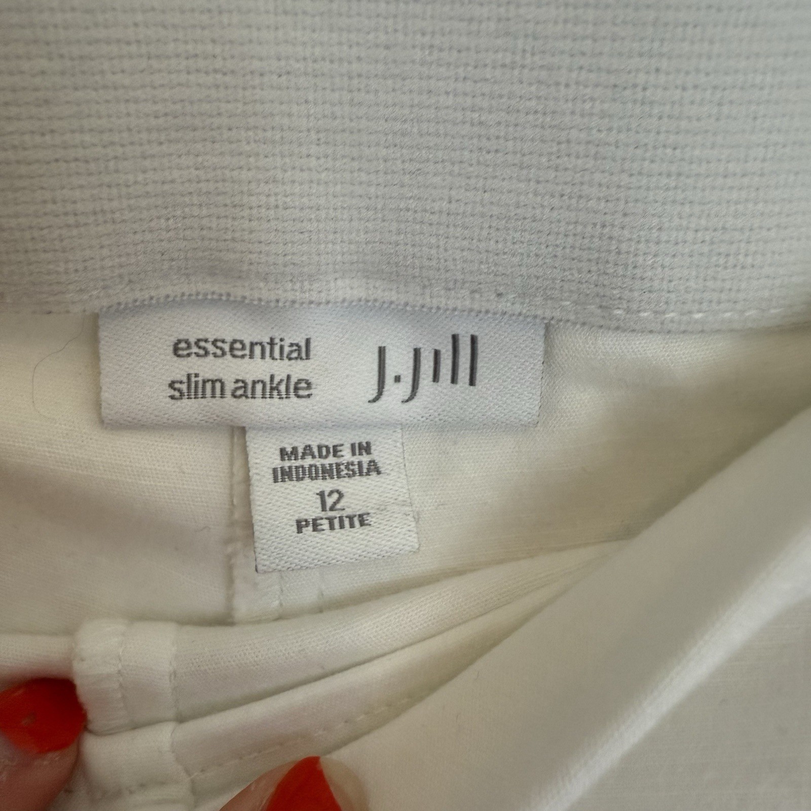 The J. Jill Essential Cotton Stretch Pants in white are designed for women in size 12 petite. These pull-on pants feature a comfortable mid-rise fit with straight legs and ankle length. Made from a blend of spandex, rayon, and cotton, these pants offer stretch and easy care with machine washable garment care. Perfect for various occasions like travel, casual outings, and parties, these pants are a versatile and stylish addition to any wardrobe. The solid white color and flat front design make them a timeless and classic choice for the modern woman. *FLAW* Stitching has come undone at the side seam, creating an unintended opening that resembles a pocket. These pants are not designed to have pockets, so this is a defect in the seam stitching. Needs minor repair. Otherwise no stains or other flaws seen. See photos for measurements