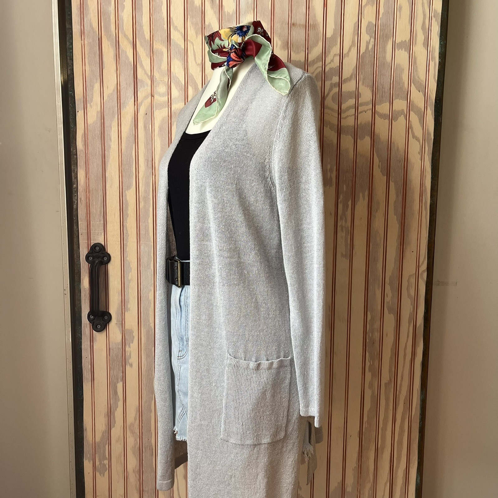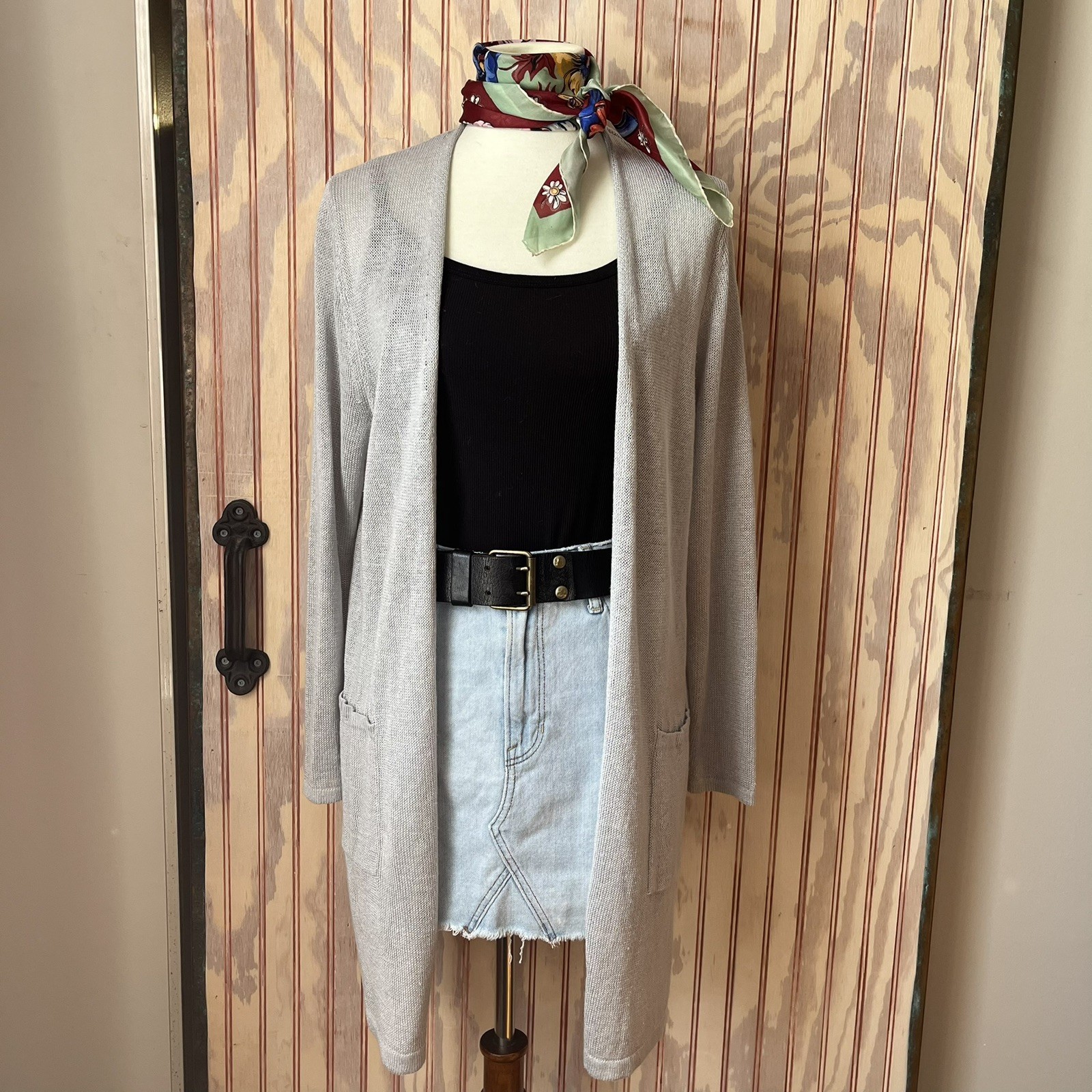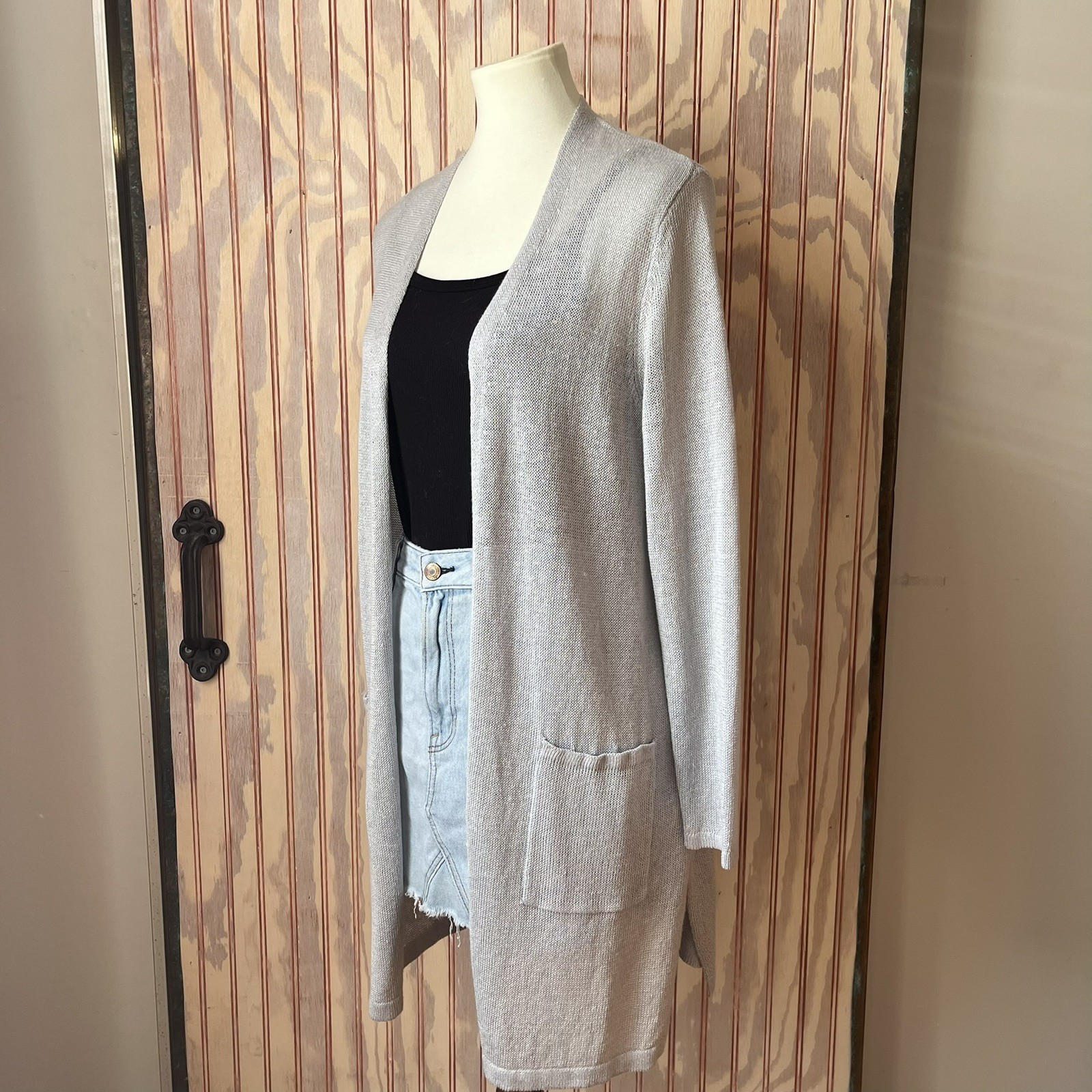 NWOT J. Jill Absolutely Perfect Metallic Gray Micro Linen & Rayon Knit Long Open Cardigan Duster w/ Pockets Size M /P Attributes: Patch Pockets Still Basted Shut, Never Worn Color: Gray Size: M Petite Measurements taken garment lying flat: Bust Armpit to Armpit- 22" Length (from base of neck)- 34" Sleeve (from shoulder)- 25" Material: Linen Blend- See picture for Full Fabric content Condition: Like New, Good, No visible Stains or Flaws THANK YOU FOR YOUR INTEREST! WE SHIP WITHIN 2 DAYS OF PURCHASE ALL RELEVANT PHOTOS ARE IN THE LISTING WILL NOT RESPOND TO MESSAGES FOR ADDITTIONAL PHOTOS OUTSIDE OF THIS APP!!! PLEASE DO REACH OUT IF THERE IS SOME SPECIFIC DETAIL YOU ARE LOOKING FOR AND WE WILL UPDATE THE LISTING WITH AN ADDITIONAL PHOTO IF POSSIBLE