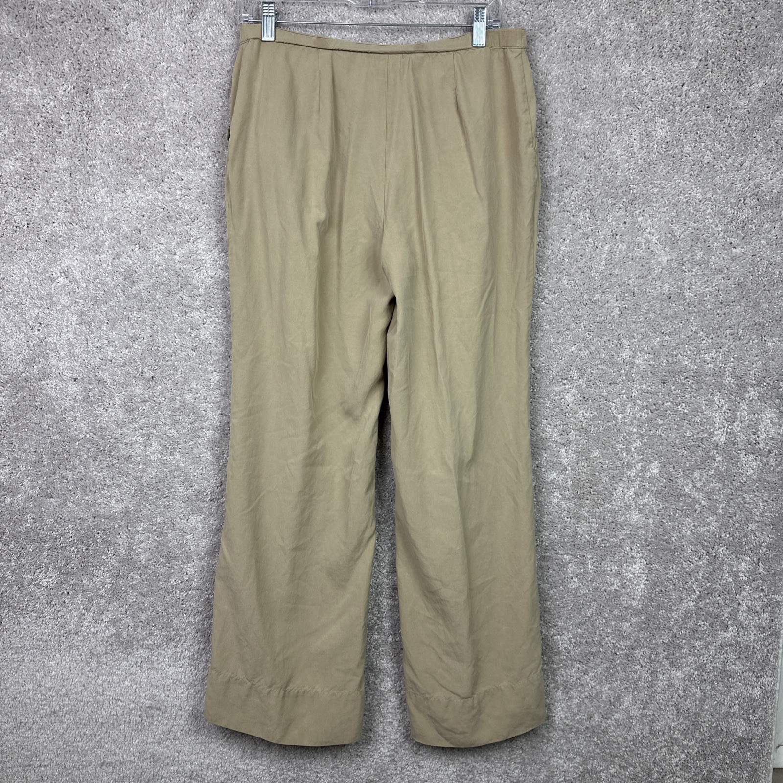 These J. Jill pants for women in size small are crafted from 100% silk in a stylish beige color. The wide-leg style with a high-rise waist offers a comfortable fit, perfect for various occasions such as travel, parties, or casual outings. The lightweight and breathable fabric, along with features like pockets and easy care instructions, make these pants a versatile and chic addition to any wardrobe. The button accents and flat front design add a touch of sophistication to these chino-inspired pants, suitable for all seasons.