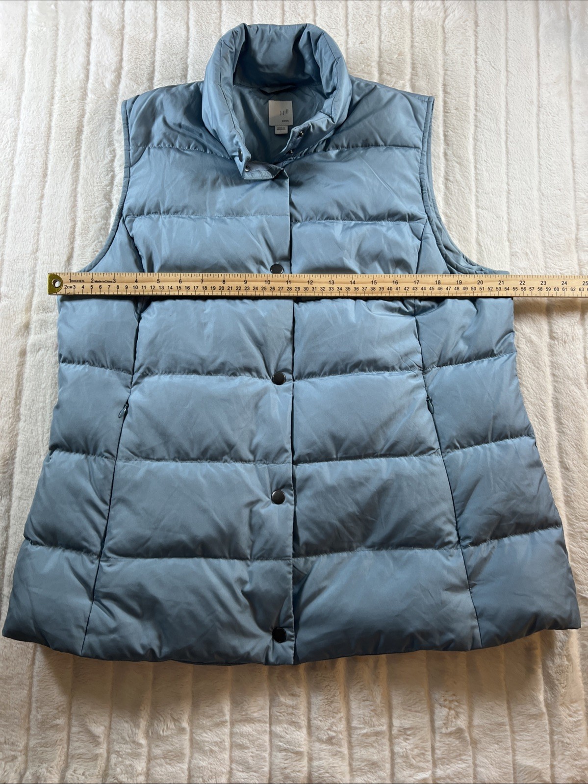 This J. Jill Women's Down Filled Puffer Vest in size Large and light blue color is a stylish and practical outerwear piece for casual occasions. Made from polyester with a cozy polyester lining, the vest features a down insulation material to keep you warm and comfortable in colder seasons. The puffer style adds a touch of flair to your wardrobe while the regular fit ensures a comfortable and flattering silhouette. Easy to care for with machine washable instructions, this vest is a versatile and stylish addition to your winter, fall, or spring wardrobe.