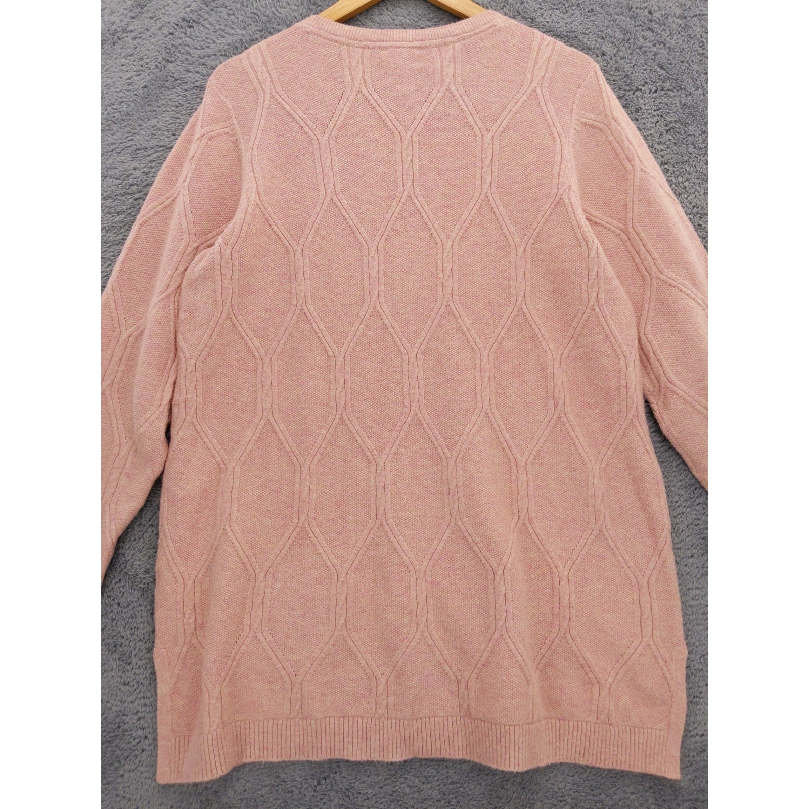 Cozy and stylish sweater featuring a soft pink hue and an all-over geometric knit pattern. The sweater has a classic round neckline and long sleeves, providing a comfortable and relaxed fit. Finely crafted sweater has a tunic length, making it perfect to pair with leggings or jeans. Measurements: • Chest Across - 20" • Neck to Hem (Back) - 31" Excellent used condition with no holes, tears, heavy wear, or stains.