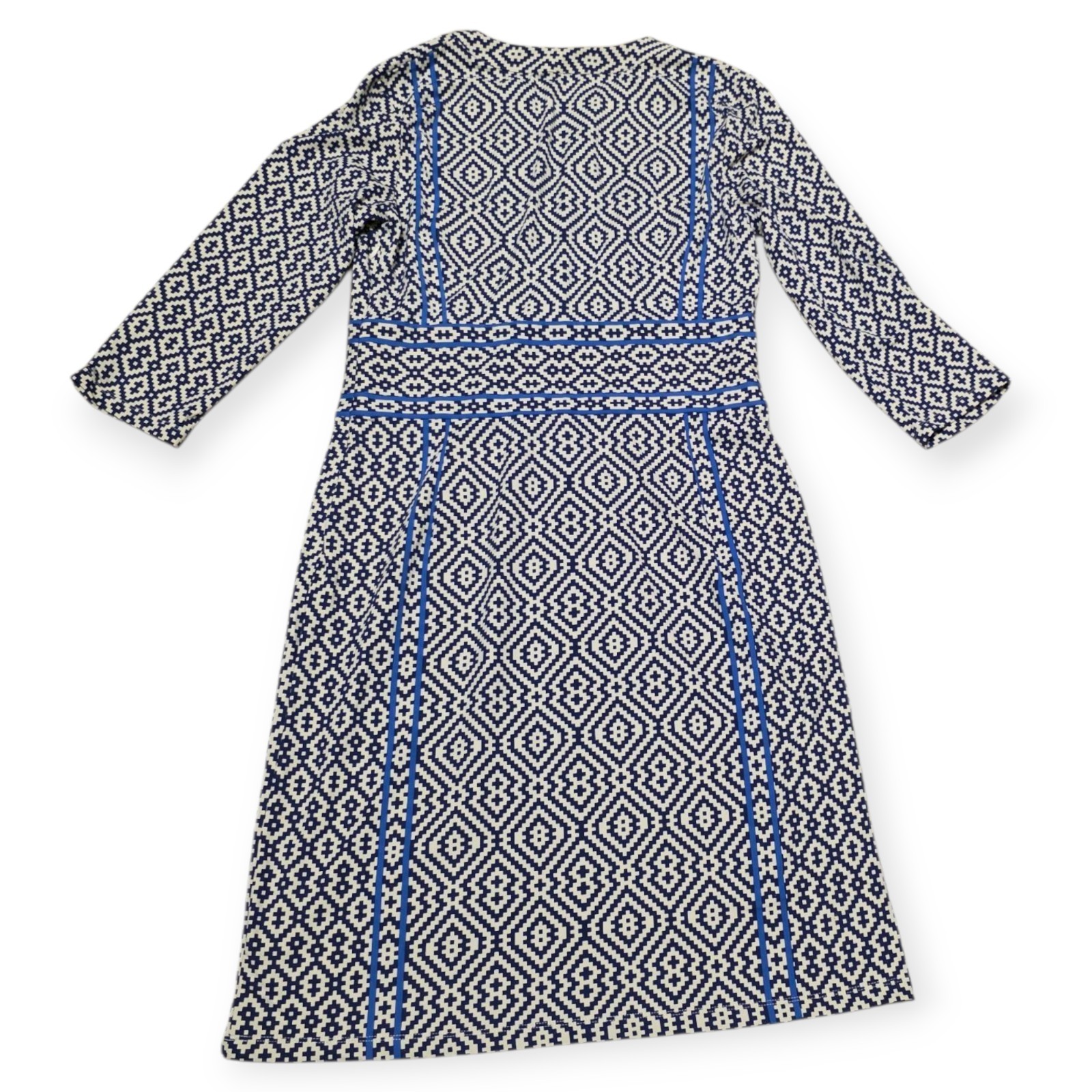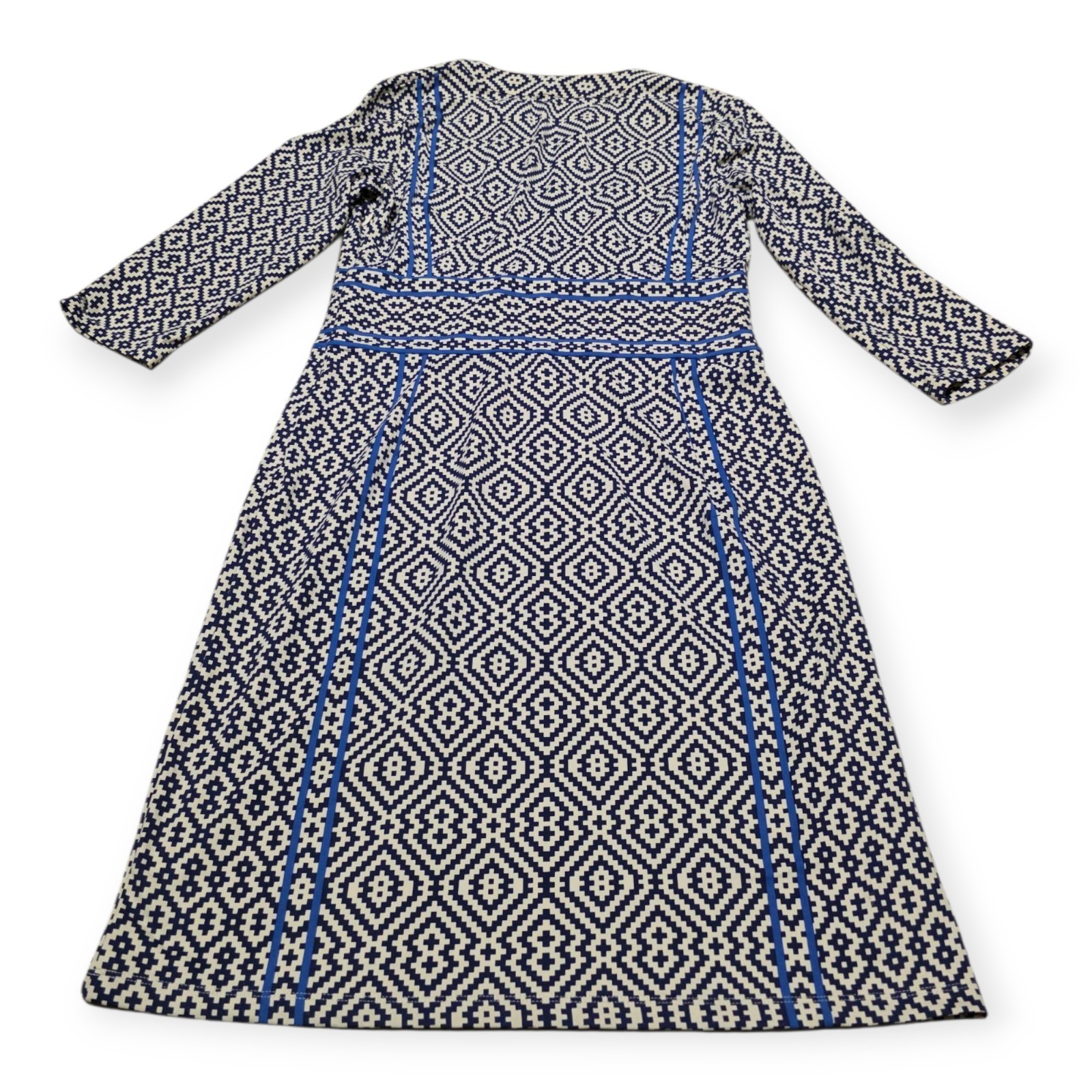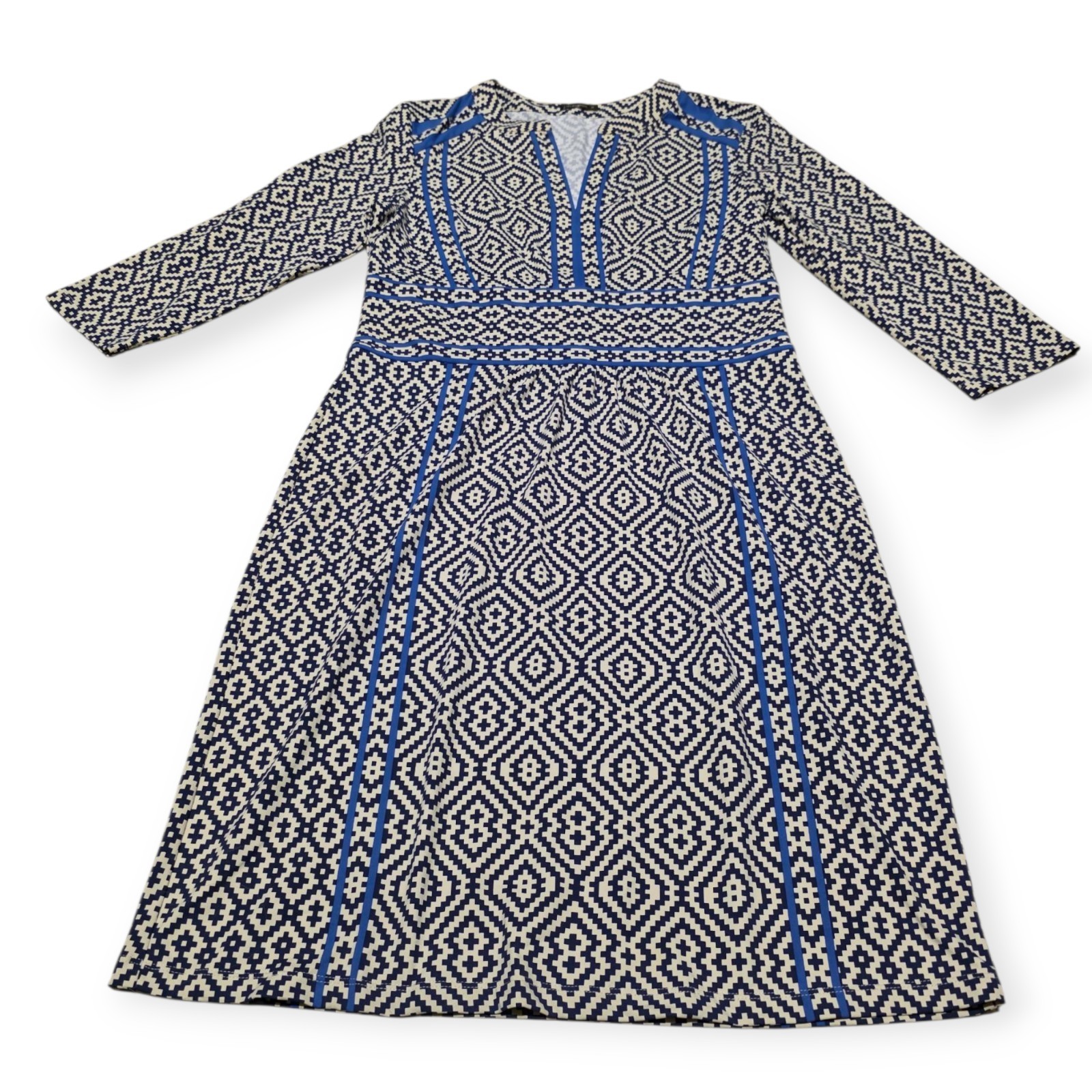 The J. McLaughlin Navy & Cream Geometric 3/4 Sleeve Dress in Women's Size Medium is a stylish and versatile piece perfect for casual occasions. Made from a comfortable nylon blend material, this knee-length sheath dress features a split neckline, zip closure, and a geometric pattern in classic navy and blue colors. With a 3/4 sleeve length and a collarless design, this dress is ideal for the summer, fall, and spring seasons, offering a blend of comfort and style. Perfect for a city-themed look, this dress is machine washable for easy care and maintenance. Approximate measurements pit to pit lying flat 19", length 39".