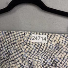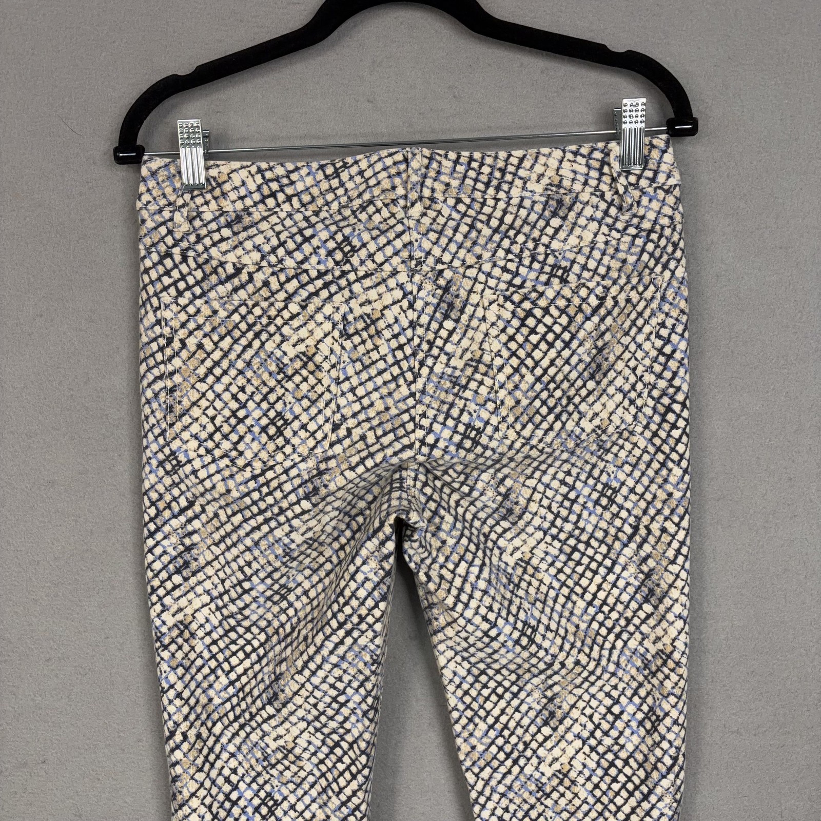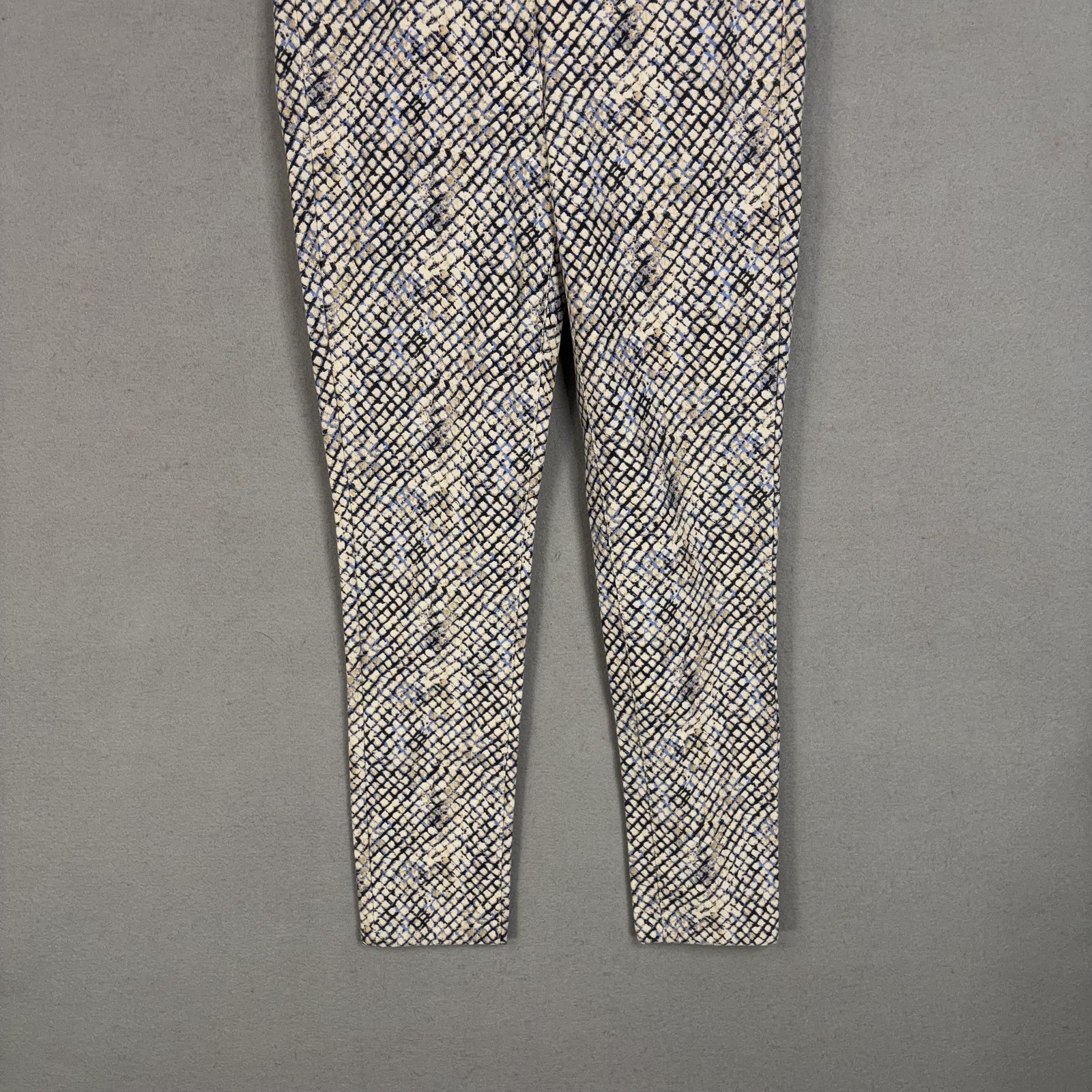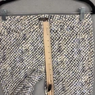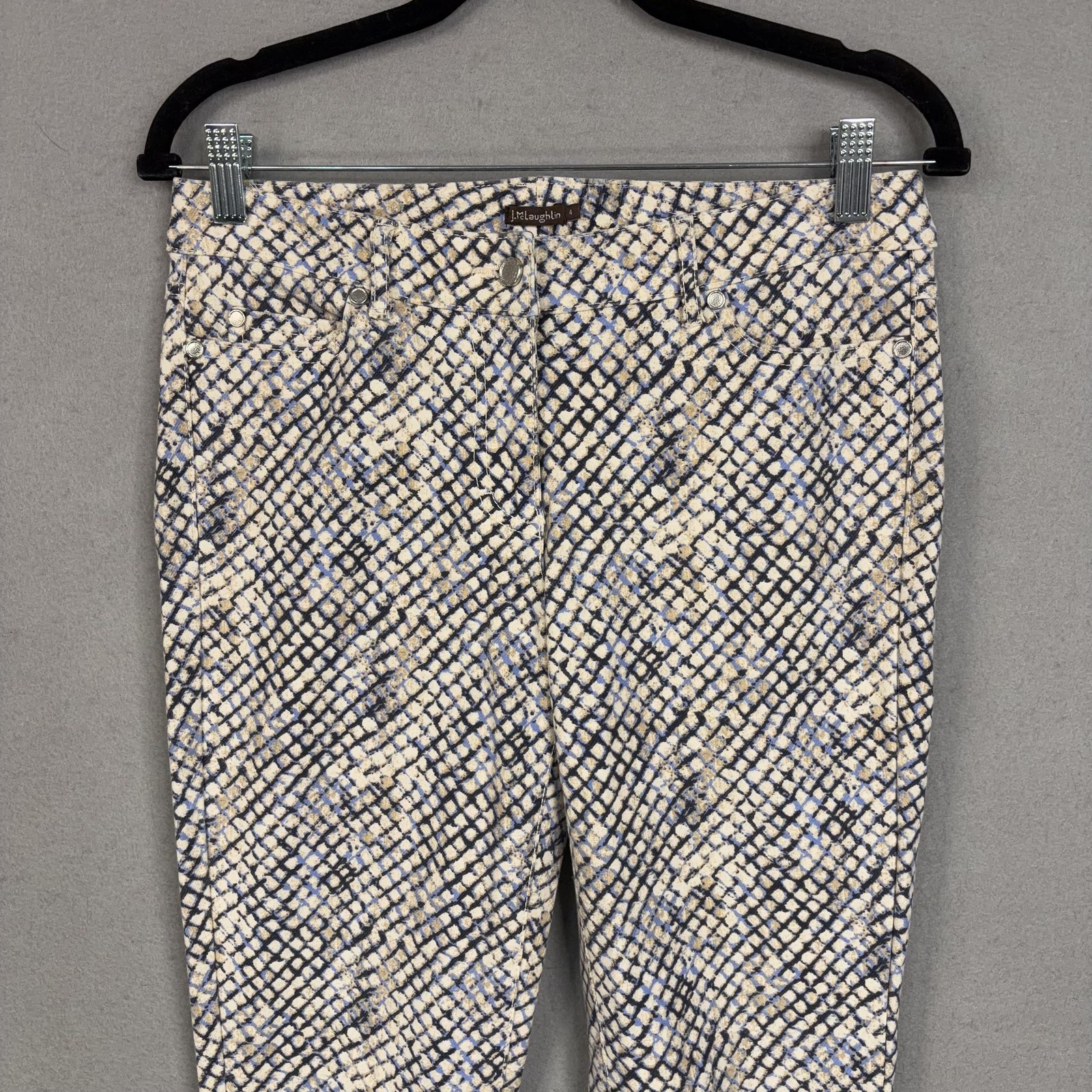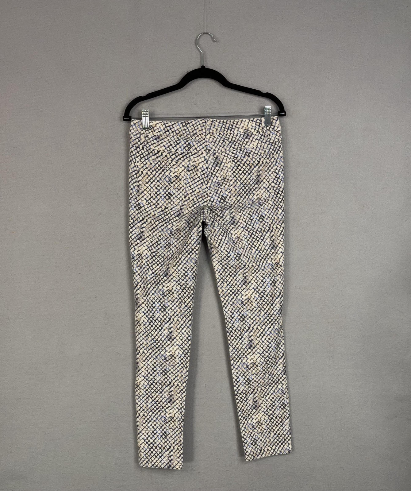J McLaughlin Pants Womens 4 Beige Animal Print Skinny Ankle Casual Resort Coast Lightly worn with faint creasing and wrinkles from storage. Fabric, animal print, seams, and hems are clean and intact; zipper, button, and pockets function properly. Interior branding and care labels are present; original retail tags are not included. Brand: J. McLaughlin Style: Womens skinny ankle pants with a slim, tailored silhouette and jean-style construction. Color: Beige with an allover blue and black animal print that resembles a subtle snakeskin pattern. Size on tag: 4. Material: Stretch twill shell in a cotton and spandex blend for comfort and flexibility; see care tag photos for full fiber content. Details: Zip fly with button closure, belt loops around the waistband, classic five-pocket layout with front scoop pockets, coin pocket, and back patch pockets. Additional design notes: Allover animal print pattern adds visual texture, ankle-length skinny legs create a streamlined look, and soft stretch fabric makes these pants suitable for casual everyday wear or dressed-up outfits. Interior brown branding label shows "J.McLaughlin" with a separate size 4 tag; interior care label lists shell composition of 95% cotton and 5% spandex with RN 119326 and printed washing instructions. Care instructions on tag recommend turning garment inside out, machine washing cold on gentle cycle with like colors, avoiding bleach, tumble drying low, and using a cool iron as needed. 24714 Measurements: Previous washings may change sizing on the tag. Refer to photos above for all measurements. Compare our measurements to one of your favorite garments. Measurements are approximate. All items are bagged and sealed after being photographed, then stored in a smoke free environment. Washed per eBay standards. I carefully package and ship daily. Contact me with any questions. Thanks