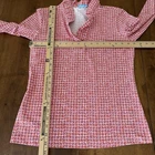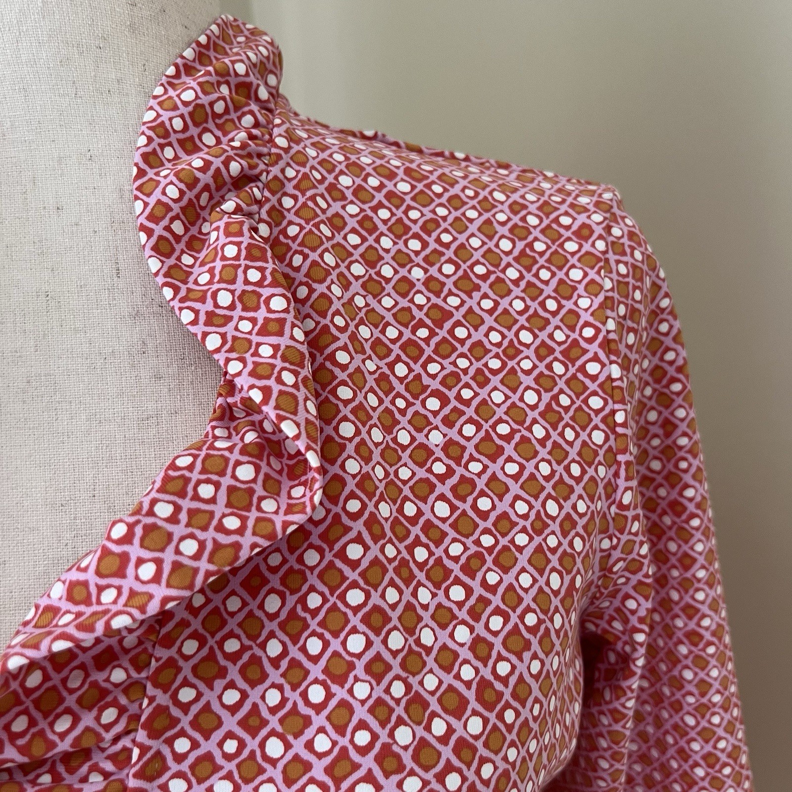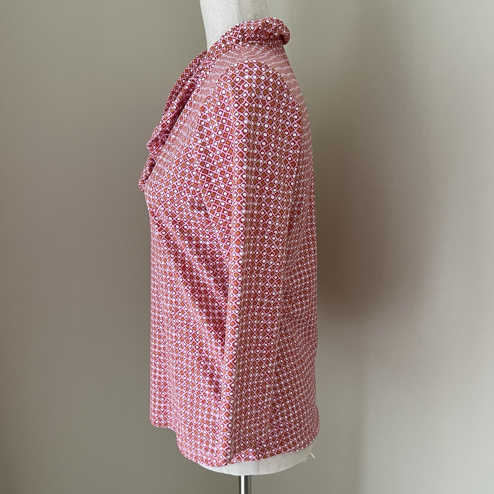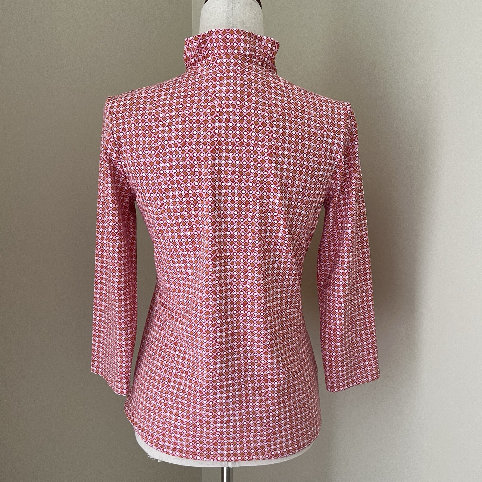 The J McLaughlin Women's Durham Ruffle Top in size small is a stylish and versatile blouse perfect for various occasions. Made from a lightweight and breathable Catalina Cloth fabric with a pink geometric pattern, this top features a flattering V-neckline, 3/4 sleeves with ruffle accents, and a pullover closure for easy wear. Ideal for travel, parties, casual outings, or business events, this top is machine washable and suitable for all seasons, making it a classic and colorful addition to any wardrobe.