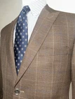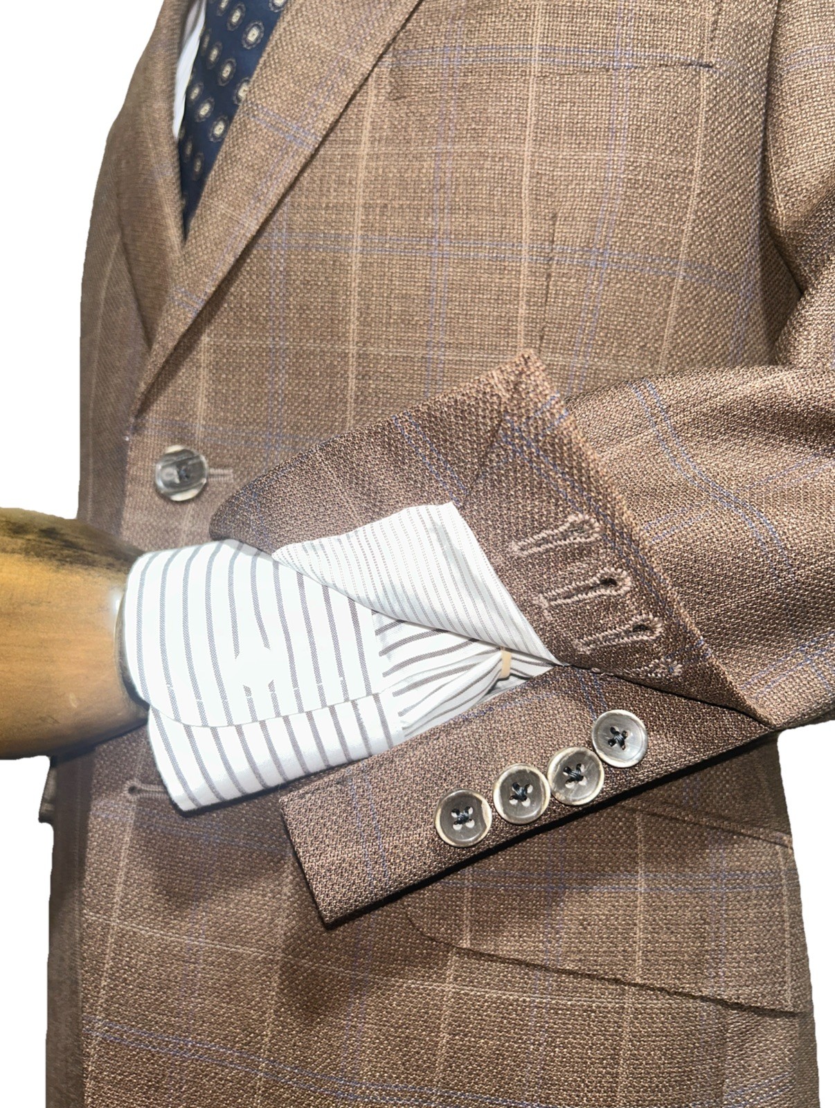Jack Victor (Custom Made) Made in Canada • Size: 38S–40S • Material: 100% Wool • Color: Brown with Blue Check Jacket Measurements (Laying Flat, Unstretched) – Chest (Pit to Pit): 42 inches – Lapel Width: 3.25 inches – Back Length (from Base of Collar): 29 inches – Waist: 39 inches – Shoulders (Seam to Seam): 18.5 inches – Sleeves (Shoulder Seam to Cuff): 23 inches – Extra Sleeve Fabric: 2 inches Jacket Features – Half Canvas Construction – Single-Breasted, 2-Button Front – Peak Lapel – Double Vent – Ticket Pocket – 4-Button Functional Surgeon Cuffs Condition: Excellent – clean, sharp, and well cared for.