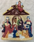 Celebrate the birth of Jesus with this eye-catching ceramic cookie jar from Jay Imports. Featuring a detailed & colorful nativity scene with dimensional figures and animals, this jar is perfect for storing your favorite holiday treats. The jar comes with a roof lid with angel/star and includes two items in total. Made with care, it's a great addition to any Christmas decor. Whether you're using it to serve cookies or as a decorative piece, this nativity scene cookie jar is sure to bring joy to your home this holiday season. 12" high x 10" wide x 7 1/2" deep One tiny chip in Shepard's pink robe- easily touched up. (see detail) Otherwise, item is pristine.